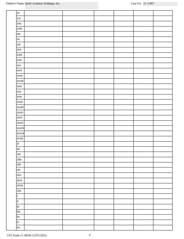 6 UST Form 11 - MOR (12/01/2021) Debtor's Name Spirit Aviation Holdings, Inc. Case No. 25 - 11897 xv xvi xvii xviii xix xx xxi xxii xxiii xxiv xxv xxvi xxvii xxviii xxix xxx xxxi xxxii xxxiii xxxiv xxxv xxxvi xxxvii xxxvii xxxix xl xli xlii xliii xliv xlv xlvi xlvii xlviii xlix l li lii liii liv lv lvi