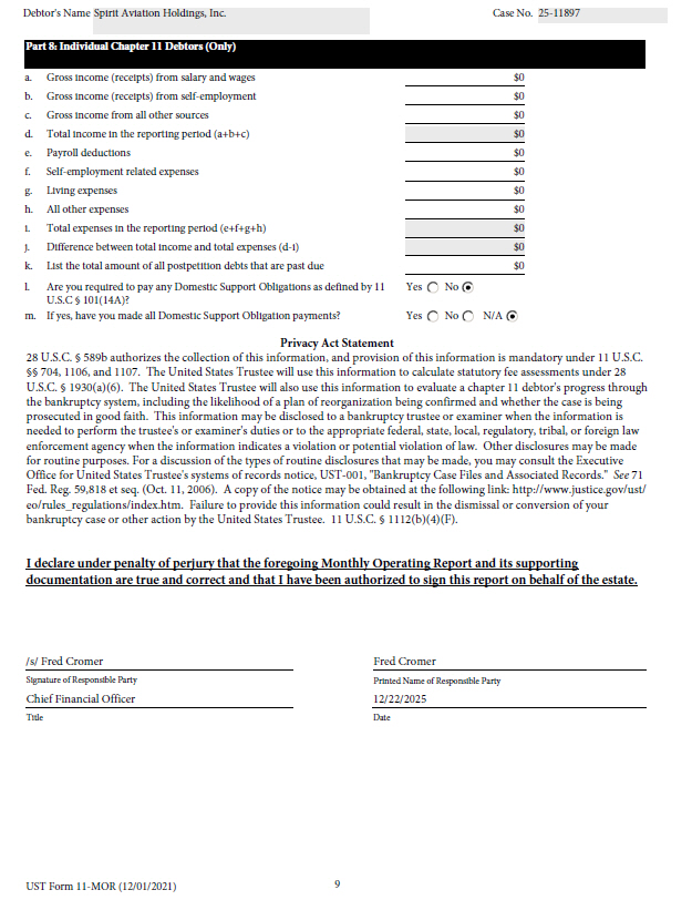 Debtor's Name Spirit Aviation Holdings, Inc. Case No. 25 - 11897 Part 8: Individual Chapter 11 Debtors (Only) $0 $0 $0 $0 $0 $0 $0 $0 $0 $0 $0 Y e s No N / A a. Gross income (receipts) from salary and wages b. Gross income (receipts) from self - employment c. Gross income from all other sources d. Total income in the reporting period (a+b+c) e. Payroll deductions f. Self - employment related expenses g. Living expenses h. All other expenses i. Total expenses in the reporting period (e+f+g+h) j. Difference between total income and total expenses (d - i) k. List the total amount of all postpetition debts that are past due l. A r e y o u r e q ui r ed t o p a y a ny D o m e s t i c S upp o r t O b lig a t i o n s a s d ef i n ed b y 1 1 Y e s No U.S.C † 101(14A)? m. If yes, have you made all Domestic Support Obligation payments? Privacy Act Statement 28 U.S.C. † 589b authorizes the collection of this information, and provision of this information is mandatory under 11 U.S.C. †† 704, 1106, and 1107. The United States Trustee will use this information to calculate statutory fee assessments under 28 U.S.C. † 1930(a)(6). The United States Trustee will also use this information to evaluate a chapter 11 debtor's progress through the bankruptcy system, including the likelihood of a plan of reorganization being confirmed and whether the case is being prosecuted in good faith. This information may be disclosed to a bankruptcy trustee or examiner when the information is needed to perform the trustee's or examiner's duties or to the appropriate federal, state, local, regulatory, tribal, or foreign law enforcement agency when the information indicates a violation or potential violation of law. Other disclosures may be made for routine purposes. For a discussion of the types of routine disclosures that may be made, you may consult the Executive Office for United States Trustee's systems of records notice, UST - 001, "Bankruptcy Case Files and Associated Records." See 71 Fed. Reg. 59,818 et seq. (Oct. 11, 2006). A copy of the notice may be obtained at the following link: http://www.justice.gov/ust/ eo/rules_regulations/index.htm. Failure to provide this information could result in the dismissal or conversion of your bankruptcy case or other action by the United States Trustee. 11 U.S.C. † 1112(b)(4)(F). I declare under penalty of perjury that the foregoing Monthly Operating Report and its supporting documentation are true and correct and that I have been authorized to sign this report on behalf of the estate. /s/ Fred Cromer Signature of Responsible Party Chief Financial Officer Printed Name of Responsible Party 12/22/2025 Date T i t le Fred Cromer 9 UST Form 11 - MOR (12/01/2021)