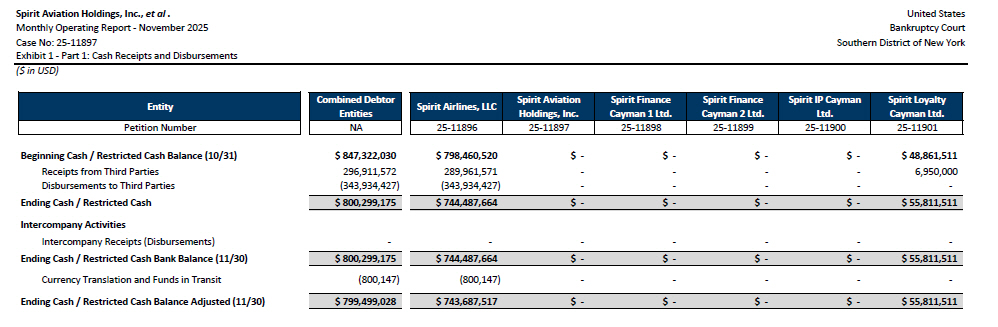 Beginning Cash / Restricted Cash Balance (10/31) Receipts from Third Parties Disbursements to Third Parties Ending Cash / Restricted Cash Intercompany Activities Intercompany Receipts (Disbursements) Ending Cash / Restricted Cash Bank Balance (11/30) Currency Translation and Funds in Transit Ending Cash / Restricted Cash Balance Adjusted (11/30) $ 847,322,030 296 , 911 , 572 ( 343 , 934 , 427) $ 800,299,175 - $ 800,299,175 ( 800 , 147) $ 799,499,028 Entity Petition Number Combined Debtor Entities NA Spirit Aviation Holdings, Inc., et al . United States Monthly Operating Report - November 2025 Bankruptcy Court Case No: 25 - 11897 Southern District of New York Exhibit 1 - Part 1: Cash Receipts and Disbursements ($ in USD) Spirit Loyalty Cayman Ltd. Spirit IP Cayman Ltd. Spirit Finance Cayman 2 Ltd. Spirit Finance Cayman 1 Ltd. Spirit Aviation Holdings, Inc. Spirit Airlines, LLC 25 - 11901 25 - 11900 25 - 11899 25 - 11898 25 - 11897 25 - 11896 $ 48,861,511 $ - $ - $ - $ - $ 798,460,520 6 , 950 , 000 - - - - 289 , 961 , 571 - - - - - ( 343 , 934 , 427) $ 55,811,511 $ - $ - $ - $ - $ 744,487,664 - - - - - - $ 55,811,511 $ - $ - $ - $ - $ 744,487,664 - - - - - ( 800 , 147) $ 55,811,511 $ - $ - $ - $ - $ 743,687,517