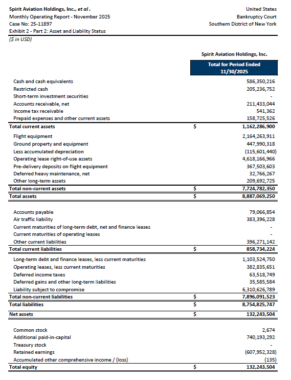 United States Spirit Aviation Holdings, Inc., et al . Bankruptcy Court Monthly Operating Report - November 2025 Southern District of New York Case No: 25 - 11897 Exhibit 2 - Part 2: Asset and Liability Status ($ in USD) Total for Period Ended 11/30/2025 586,350,216 Cash and cash equivalents 205,236,752 Restricted cash - Short - term investment securities 211,433,044 Accounts receivable, net 541,362 Income tax receivable 158,725,526 Prepaid expenses and other current assets $ 1 , 162 , 286 , 900 Total current assets Spirit Aviation Holdings, Inc. 2,164,263,911 Flight equipment 447,990,318 Ground property and equipment ( 115,601,440) Less accumulated depreciation 4,618,166,966 Operating lease right - of - use assets 367,503,603 Pre - delivery deposits on flight equipment 32,766,267 Deferred heavy maintenance, net 209,692,725 Other long - term assets $ 7 , 724 , 782 , 350 Total non - current assets $ 8 , 887 , 069 , 250 Total assets 79,066,854 Accounts payable 383,396,228 Air traffic liability - Current maturities of long - term debt, net and finance leases - Current maturities of operating leases 396,271,142 Other current liabilities $ 858 , 734 , 224 Total current liabilities 1,103,524,750 Long - term debt and finance leases, less current maturities 382,835,651 Operating leases, less current maturities 63,518,749 Deferred income taxes 35,585,584 Deferred gains and other long - term liabilities 6,310,626,789 Liability subject to compromise 7 , 896 , 091 , 523 $ Total non - current liabilities 8 , 754 , 825 , 747 $ Total liabilities 132 , 243 , 504 $ Net assets 2,674 Common stock 740,193,292 Additional paid - in - capital - Treasury stock ( 607,952,328) Retained earnings ( 135) Accumulated other comprehensive income / (loss) $ 132 , 243 , 504 Total equity
