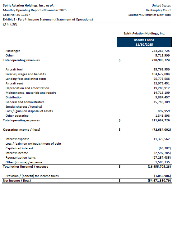 Spirit Aviation Holdings, Inc. Month Ended 11/30/2025 $ (72,684,002) Operating income / (loss) United States Spirit Aviation Holdings, Inc., et al . Bankruptcy Court Monthly Operating Report - November 2025 Southern District of New York Case No: 25 - 11897 Exhibit 3 - Part 4: Income Statement (Statement of Operations) ($ in USD) 233,269,725 Passenger 5,713,999 Other $ 238,983,724 Total operating revenues 65,766,959 Aircraft fuel 104,677,084 Salaries, wages and benefits 25,775,588 Landing fees and other rents 23,972,451 Aircraft rent 19,288,912 Depreciation and amortization 14,716,109 Maintenance, materials and repairs 9,884,457 Distribution 45,746,309 General and administrative - Special charges / (credits) 497,959 Loss / (gain) on disposal of assets 1,341,898 Other operating $ 311,667,726 Total operating expenses 11,379,562 Interest expense - Loss / (gain) on extinguishment of debt (69,382) Capitalized interest (2,597,785) Interest income (27,257,435) Reorganization items 1,589,335 Other (income) / expense $ ( 16,955,705 . 23) Total other (income) / expense ( 1,056,906) Provision / (benefit) for income taxes $ ( 54,671,390 . 79) Net income / (loss)
