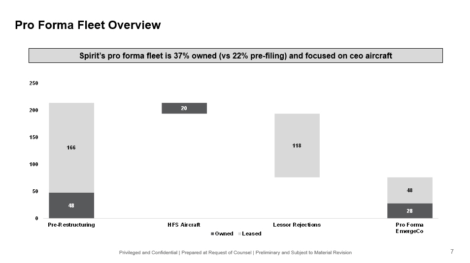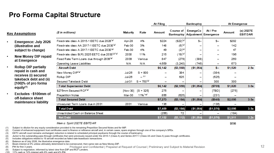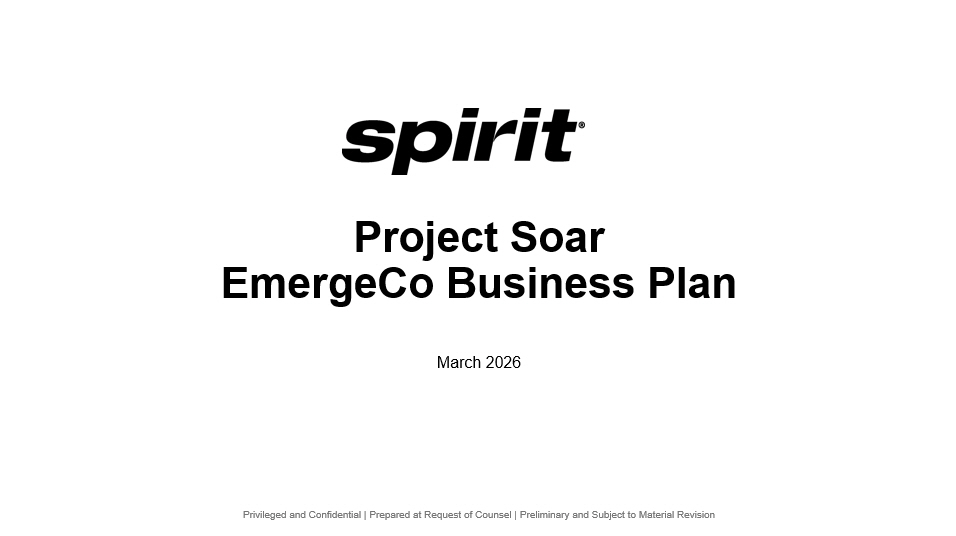 Privileged and Confidential | Prepared at Request of Counsel | Preliminary and Subject to Material Revision Pro Forma Capital Structure (1) Subject to dilution for any equity consideration provided to the remaining Prepetition Secured Notes and for MIP. (2) Consist of enhanced equipment trust certificates used to finance or refinance aircraft and, in certain cases, spare engines t hro ugh one of the company's SPEs. (3) EETC aircraft count remains unchanged; reduction is related to scheduled principal paydowns through the course of bankruptcy. (4) Junior to the outstanding pass - through certificates that were previously issued under the 2015 - 1 (Class A) and Series 2017 - 1 (Cl ass AA and Class A) pass through certificates. (5) Includes obligations related to 18 aircraft recorded as failed sale - leaseback transactions. (6) Balance as of July 2026, the illustrative emergence date. (7) Bears interest at 0% unless ultimately determined to be oversecured, then same rate as New Money DIP. (8) PIK for first 3 years. (9) Subject to negotiation, informed by latest view from DIP and RCF Lenders. (10) 11% cash or 12% interest with 8% cash and 4% PIK. At Filing Bankruptcy At Emergence ($ in millions) Maturity Rate Amount Course of Bankruptcy EmergeCo Adjustment At / Pre Emergence Amount (x) 2027E EBITDAR Fixed-rate class A 2015-1 EETC due 2028 ⁽ ² ⁾ Apr-28 4% $224 ($22) ⁽ ³ ⁾ $– $– $202 Fixed-rate class AA 2017-1 EETC due 2030 ⁽ ² ⁾ Feb-30 3% 148 (6) ⁽ ³ ⁾ – – 142 Fixed-rate class A 2017-1 EETC due 2030 ⁽ ² ⁾ Feb-30 4% 49 (2) ⁽ ³ ⁾ – – 47 Fixed-rate class B(R) 2025 EETC due 2030 ⁽ ² ⁾⁽ ⁴ ⁾ 2030 11% 215 (19) ⁽ ³ ⁾ – – 196 Fixed Rate Term Loans due through 2039 ⁽ ⁵ ⁾ 2039 Various 847 (279) (308) – 260 Operating Lease Liabilities N/A N/A 4,659 (3,240) (746) – 673 Aircraft Debt $6,142 ($3,568) ($1,054) $– $1,520 2.5x New Money DIP ⁽ ⁶ ⁾ Jul-26 S + 800 – 384 – (384) – Rollup DIP Jul-26 – ⁽ ⁷ ⁾ – 625 – (625) – Secured Takeback Debt Jul-31 S + 750 ⁽ ⁸ ⁾ – – – 300 300 Total Supersenior Debt $6,142 ($2,559) ($1,054) ($709) $1,820 3.0x $275mm Secured RCF ⁽ ⁹ ⁾ [Nov-30] [S + 325] 275 – – [TBD] [275] Prepetition Notes Mar-30 11% ⁽ ¹⁰ ⁾ 856 (625) – (231) – Total Secured Debt $7,273 ($3,184) ($1,054) ($940) $2,095 3.5x Unsecured Term Loans due in 2031 2031 Various 136 – – (136) – Total Debt $7,409 ($3,184) ($1,054) ($1,076) $2,095 3.5x Unrestricted Cash on Balance Sheet (256) 72 – – (184) Net Debt $7,152 ($3,112) ($1,054) ($1,076) $1,911 3.2x Memo: Spirit 2027E EBITDAR $598 Key Assumptions • Emergence: July 2026 (illustrative and subject to change) • New Money DIP repaid at Emergence • Rollup DIP partially repaid in cash and receives ( i ) secured takeback debt and (ii) [100]% of pro forma equity (1) • Excludes ~$100mm of off - balance sheet maintenance liability 12