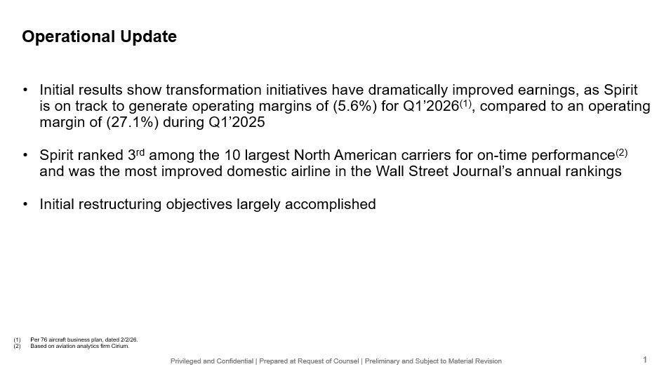 Privileged and Confidential | Prepared at Request of Counsel | Preliminary and Subject to Material Revision Operational Update • Initial results show transformation initiatives have dramatically improved earnings, as Spirit is on track to generate operating margins of (5.6%) for Q1’2026 (1) , compared to an operating margin of (27.1%) during Q1’2025 • Spirit ranked 3 rd among the 10 largest North American carriers for on - time performance (2) and was the most improved domestic airline in the Wall Street Journal’s annual rankings • Initial restructuring objectives largely accomplished (1) Per 76 aircraft business plan, dated 2/2/26. (2) Based on aviation analytics firm Cirium . 1