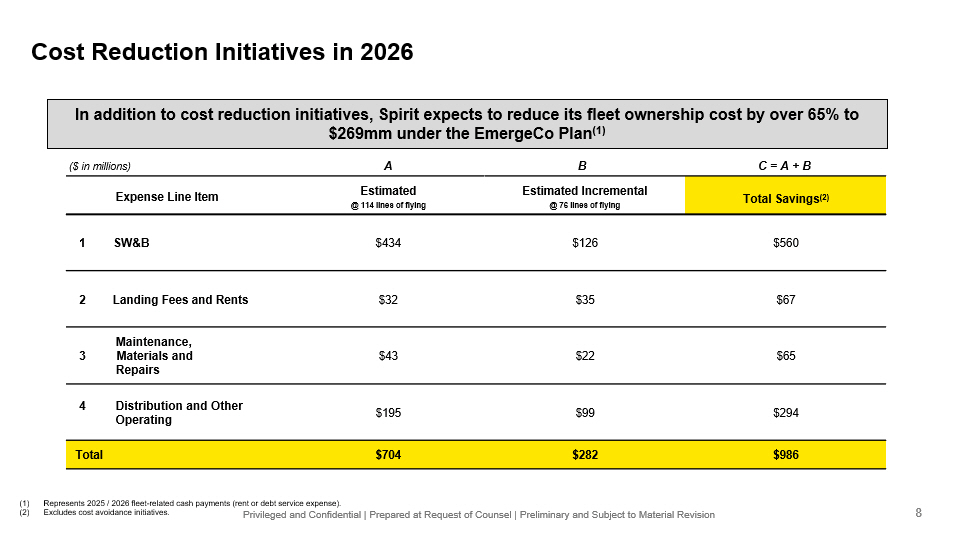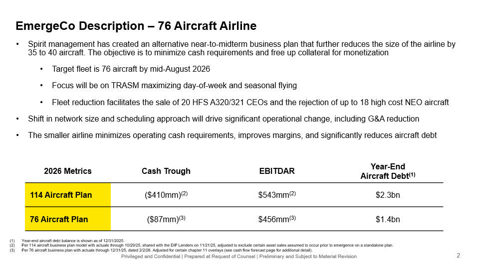 Privileged and Confidential | Prepared at Request of Counsel | Preliminary and Subject to Material Revision EmergeCo Description – 76 Aircraft Airline • Spirit management has created an alternative near - to - midterm business plan that further reduces the size of the airline by 35 to 40 aircraft. The objective is to minimize cash requirements and free up collateral for monetization • Target fleet is 76 aircraft by mid - August 2026 • Focus will be on TRASM maximizing day - of - week and seasonal flying • Fleet reduction facilitates the sale of 20 HFS A320/321 CEOs and the rejection of up to 18 high cost NEO aircraft • Shift in network size and scheduling approach will drive significant operational change, including G&A reduction • The smaller airline minimizes operating cash requirements, improves margins, and significantly reduces aircraft debt Year - End Aircraft Debt (1) EBITDAR Cash Trough 2026 Metrics $2.3bn $543mm (2) ($410mm) (2) 114 Aircraft Plan $1.4bn $456mm (3) ($87mm) (3) 76 Aircraft Plan (1) Year - end aircraft debt balance is shown as of 12/31/2025. (2) Per 114 aircraft business plan model with actuals through 10/29/25, shared with the DIP Lenders on 11/21/25, adjusted to excl ude certain asset sales assumed to occur prior to emergence on a standalone plan. (3) Per 76 aircraft business plan with actuals through 12/31/25, dated 2/2/26. Adjusted for certain chapter 11 overlays (see cash fl ow forecast page for additional detail). 2