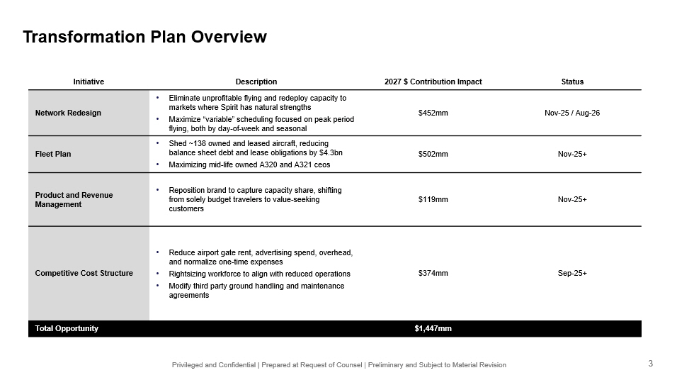 Privileged and Confidential | Prepared at Request of Counsel | Preliminary and Subject to Material Revision Transformation Plan Overview Status 2027 $ Contribution Impact Description Initiative Nov - 25 / Aug - 26 $452mm • Eliminate unprofitable flying and redeploy capacity to markets where Spirit has natural strengths • Maximize “variable” scheduling focused on peak period flying, both by day - of - week and seasonal Network Redesign Nov - 25+ $502mm • Shed ~138 owned and leased aircraft, reducing balance sheet debt and lease obligations by $4.3bn • Maximizing mid - life owned A320 and A321 ceos Fleet Plan Nov - 25+ $119mm • Reposition brand to capture capacity share, shifting from solely budget travelers to value - seeking customers Product and Revenue Management Sep - 25+ $374mm • Reduce airport gate rent, advertising spend, overhead, and normalize one - time expenses • Rightsizing workforce to align with reduced operations • Modify third party ground handling and maintenance agreements Competitive Cost Structure $1,447mm Total Opportunity 3