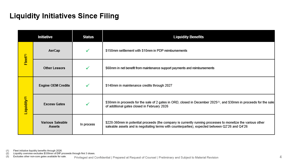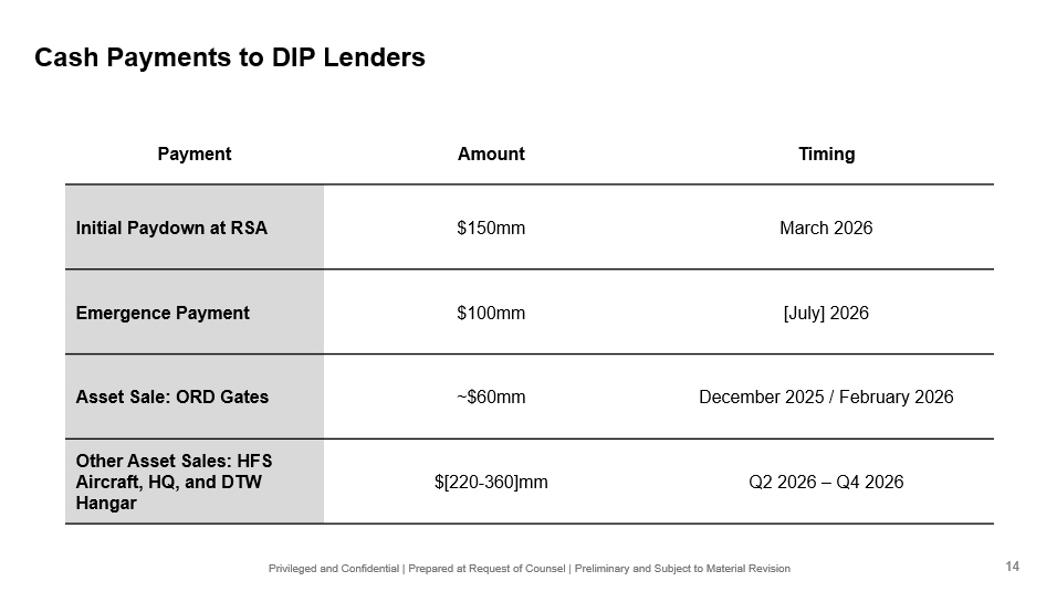 Privileged and Confidential | Prepared at Request of Counsel | Preliminary and Subject to Material Revision Cash Payments to DIP Lenders Timing Amount Payment March 2026 $150mm Initial Paydown at RSA [July] 2026 $100mm Emergence Payment December 2025 / February 2026 ~$60mm Asset Sale: ORD Gates Q2 2026 – Q4 2026 $[220 - 360]mm Other Asset Sales: HFS Aircraft, HQ, and DTW Hangar 14