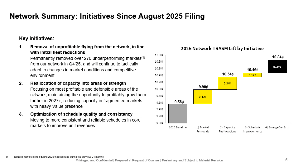 Privileged and Confidential | Prepared at Request of Counsel | Preliminary and Subject to Material Revision 0.42¢ 0.36¢ 0.12¢ 0.38¢ 2025 Baseline 1) Market Removals 2) Capacity Reallocations 3) Schedule Improvements 4) EmergeCo (Est.) 9.00¢ 9.20¢ 9.40¢ 9.60¢ 9.80¢ 10.00¢ 10.20¢ 10.40¢ 10.60¢ 10.80¢ 11.00¢ 2026 Network TRASM Lift by Initiative Network Summary: Initiatives Since August 2025 Filing 9.56 ¢ 9.98 ¢ 10.34 ¢ 10.46 ¢ 10.84 ¢ Key initiatives: 1. Removal of unprofitable flying from the network, in line with initial fleet reductions Permanently removed over 270 underperforming markets (1) from our network in Q4’25, and will continue to tactically adapt to changes in market conditions and competitive environment 2. Reallocation of capacity into areas of strength Focusing on most profitable and defensible areas of the network, maintaining the opportunity to profitably grow them further in 2027+; reducing capacity in fragmented markets with heavy Value presence 3. Optimization of schedule quality and consistency Moving to more consistent and reliable schedules in core markets to improve unit revenues 5 (1) Includes markets exited during 2025 that operated during the previous 24 months.