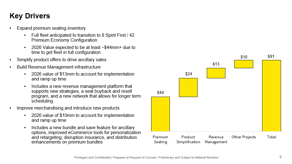 Privileged and Confidential | Prepared at Request of Counsel | Preliminary and Subject to Material Revision $ 44 $ 24 $ 13 $ 10 $91 Premium Seating Product Simplification Revenue Management Other Projects Total • Expand premium seating inventory • Full fleet anticipated to transition to 8 Spirit First / 42 Premium Economy Configuration • 2026 Value expected to be at least ~$44mm+ due to time to get fleet in full configuration • Simplify product offers to drive ancillary sales • Build Revenue Management infrastructure • 2026 value of $13mm to account for implementation and ramp up time • Includes a new revenue management platform that supports new strategies, a seat buyback and resell program, and a new network that allows for longer term scheduling • Improve merchandising and introduce new products • 2026 value of $10mm to account for implementation and ramp up time • Includes a new bundle and save feature for ancillary options, improved eCommerce tools for personalization and retargeting, disruption insurance, and distribution enhancements on premium bundles 6 Key Drivers