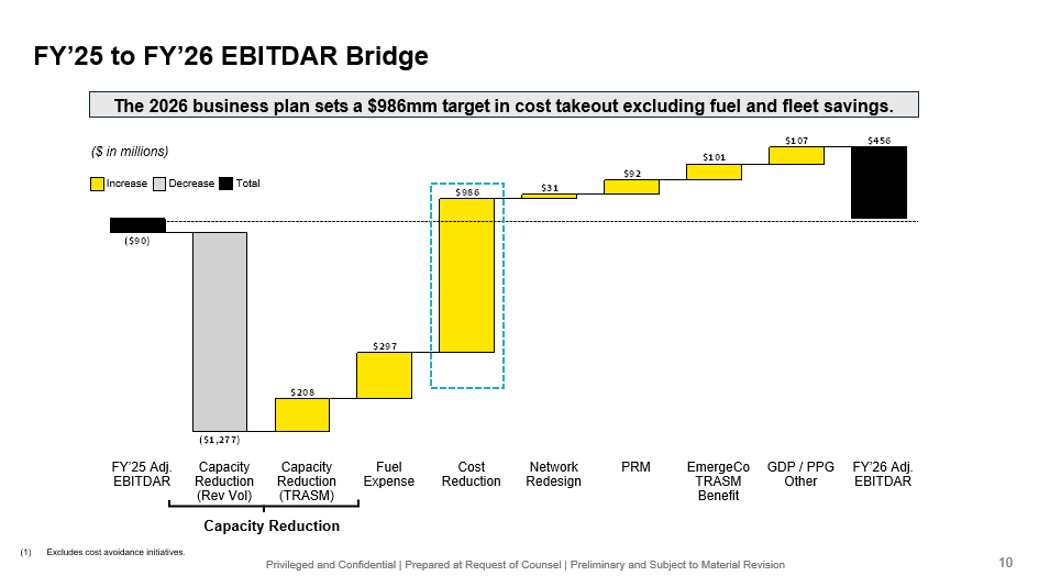 Privileged and Confidential | Prepared at Request of Counsel | Preliminary and Subject to Material Revision ($90) ($1,277) $208 $297 $986 $31 $92 $101 $107 $456 Increase Decrease Total FY’25 to FY’26 EBITDAR Bridge The 2026 business plan sets a $ 986 mm target in cost takeout excluding fuel and fleet savings . ($ in millions) Capacity Reduction FY’25 Adj. EBITDAR Capacity Reduction (Rev Vol) Fuel Expense Cost Reduction Network Redesign PRM Capacity Reduction (TRASM) EmergeCo TRASM Benefit GDP / PPG Other FY’26 Adj. EBITDAR (1) Excludes cost avoidance initiatives. 10