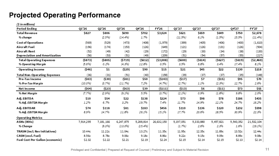 Privileged and Confidential | Prepared at Request of Counsel | Preliminary and Subject to Material Revision Projected Operating Performance ($ in millions) Period Ending Q1'26 Q2'26 Q3'26 Q4'26 FY'26 Q1'27 Q2'27 Q3'27 Q4'27 FY'27 Total Revenue $827 $806 $690 $702 $3,024 $621 $659 $649 $750 $2,678 % change (2.5%) (14.4%) 1.7% (11.5%) 6.1% (1.5%) 15.5% (11.4%) Cost of Operations (569) (529) (473) (408) (1,979) (399) (405) (406) (400) (1,610) Aircraft Fuel (196) (174) (153) (126) (649) (121) (126) (131) (126) (504) Aircraft Rent (52) (49) (42) (29) (172) (29) (30) (34) (38) (130) Depreciation and Amortization (56) (53) (51) (49) (209) (51) (54) (57) (55) (217) Total Operating Expenses ($873) ($805) ($719) ($612) ($3,008) ($600) ($614) ($627) ($619) ($2,460) % Operating Margin (5.6%) 0.2% (4.3%) 12.8% 0.5% 3.5% 6.8% 3.4% 17.4% 8.1% Operating Income ($46) $1 ($29) $90 $15 $21 $45 $22 $130 $218 Total Non-Operating Expenses (36) (31) (51) (40) (158) (39) (37) (37) (35) (148) Pre-Tax Income ($83) ($30) ($81) $50 ($143) ($17) $7 ($15) $95 $70 % Pre-Tax Margin (10.0%) (3.7%) (11.7%) 7.2% (4.7%) (2.7%) 1.1% (2.3%) 12.7% 2.6% Net Income ($64) ($23) ($63) $39 ($111) ($13) $6 ($11) $73 $55 % Net Margin (7.7%) (2.9%) (9.1%) 5.5% (3.7%) (2.1%) 0.9% (1.8%) 9.8% 2.0% Adj. EBITDA $10 $54 $22 $138 $224 $73 $98 $78 $186 $435 % Adj. EBITDA Margin 1.2% 6.7% 3.2% 19.7% 7.4% 11.7% 14.9% 12.1% 24.7% 16.2% Adj. EBITDAR $74 $118 $81 $183 $456 $110 $136 $120 $232 $598 % Adj. EBITDA Margin 8.9% 14.7% 11.8% 26.1% 15.1% 17.7% 20.6% 18.5% 30.9% 22.3% Operating Metrics ASMs (000s) 7,914,295 7,181,166 6,247,875 5,288,814 26,632,150 5,197,051 5,333,880 5,457,821 5,543,352 21,532,104 % Change (9.3%) (13.0%) (15.4%) (1.7%) 2.6% 2.3% 1.6% (19.1%) TRASM (incl. Rev Initiatives) 10.44c 11.22c 11.04c 13.27c 11.35c 11.95c 12.35c 11.89c 13.52c 12.44c CASM (excl. Fuel) 8.56c 8.78c 9.06c 9.18c 8.86c 9.22c 9.15c 9.09c 8.89c 9.08c Fuel Cost Per Gallon (economic) $2.32 $2.22 $2.21 $2.19 $2.24 $2.15 $2.14 $2.15 $2.13 $2.14 11
