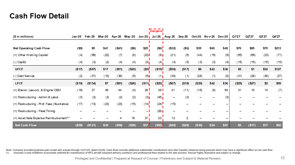 Privileged and Confidential | Prepared at Request of Counsel | Preliminary and Subject to Material Revision Cash Flow Detail Note: Company provided business plan model with actuals through 12/31/25, dated 2/2/26. Cash flows exclude additional stakeho lde r contributions and other liquidity initiatives being pursued which may have a significant effect on net cash flow. (1) Assumes a total of $98mm of proceeds withheld for maintenance of HFS aircraft (required delivery condition) and professional fee s related to the sale process. Amount highly illustrative and subject to change. 13 Emergence ($ in millions) Jan-26 Feb-26 Mar-26 Apr-26 May-26 Jun-26 Jul-26 Aug-26 Sep-26 Oct-26 Nov-26 Dec-26 Q1'27 Q2'27 Q3'27 Q4'27 Net Operating Cash Flow ($9) $5 $41 ($41) ($8) $25 ($6) ($32) ($6) $55 $60 $49 $76 $85 $70 $213 (+) Other Working Capital (4) (99) (22) (7) (8) (22) (9) (21) (6) (44) (15) (9) (55) (69) (23) (71) (-) CapEx (4) (3) (2) (4) (4) (8) (4) (4) (5) (3) (3) (4) (15) (15) (15) (15) UFCF ($17) ($97) $17 ($51) ($20) ($5) ($19) ($56) ($17) $8 $43 $36 $5 $1 $32 $127 (-) Debt Service (2) (37) (10) (30) (6) (6) (1) (30) (1) (28) (1) (0) (31) (28) (30) (27) LFCF ($19) ($134) $7 ($81) ($26) ($11) ($20) ($87) ($18) ($20) $42 $36 ($25) ($27) $2 $99 (+) Elavon, Lessors, & Engine OEM (19) 27 49 44 (4) 28 38 41 (11) (16) (8) 64 31 10 14 (7) (+) Restructuring - Admin & Labor (3) (2) (3) (2) (2) (3) (45) – (2) – – (3) – – – – (+) Restructuring - Prof. Fees (Illustrative) (17) (13) (23) (23) (15) (14) (24) (15) – – – – – – – – (+) Restructuring - Fleet Timing – – – – – – (28) – – – – – – – – – (+) Asset Sale Expense Reimbursement ⁽ ¹ ⁾ – – – 4 18 37 23 13 2 – – – – – – – Net Cash Flow ($58) ($121) $30 ($58) ($28) $37 ($56) ($48) ($28) ($36) $34 $97 $5 ($17) $17 $92
