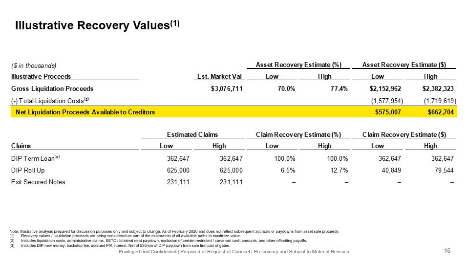 Privileged and Confidential | Prepared at Request of Counsel | Preliminary and Subject to Material Revision Illustrative Recovery Values (1) ($ in thousands) Asset Recovery Estimate (%) Asset Recovery Estimate ($) Illustrative Proceeds Est. Market Val Low High Low High Gross Liquidation Proceeds $3,076,711 70.0% 77.4% $2,152,962 $2,382,323 (-) Total Liquidation Costs ⁽ ² ⁾ (1,577,954) (1,719,619) Net Liquidation Proceeds Available to Creditors $575,007 $662,704 Estimated Claims Claim Recovery Estimate (%) Claim Recovery Estimate ($) Claims Low High Low High Low High DIP Term Loan ⁽ ³ ⁾ 362,647 362,647 100.0% 100.0% 362,647 362,647 DIP Roll Up 625,000 625,000 6.5% 12.7% 40,849 79,544 Exit Secured Notes 231,111 231,111 – – – – Note: Illustrative analysis prepared for discussion purposes only and subject to change. As of February 2026 and does not ref lec t subsequent accruals or paydowns from asset sale proceeds. (1) Recovery values / liquidation proceeds are being considered as part of the exploration of all available paths to maximize val ue. (2) Includes liquidation costs, administrative claims, EETC / bilateral debt paydown, exclusion of certain restricted / carve - out ca sh amounts, and other offsetting payoffs. (3) Includes DIP new money, backstop fee, accrued PIK interest. Net of $30mm of DIP paydown from sale first pair of gates. 16