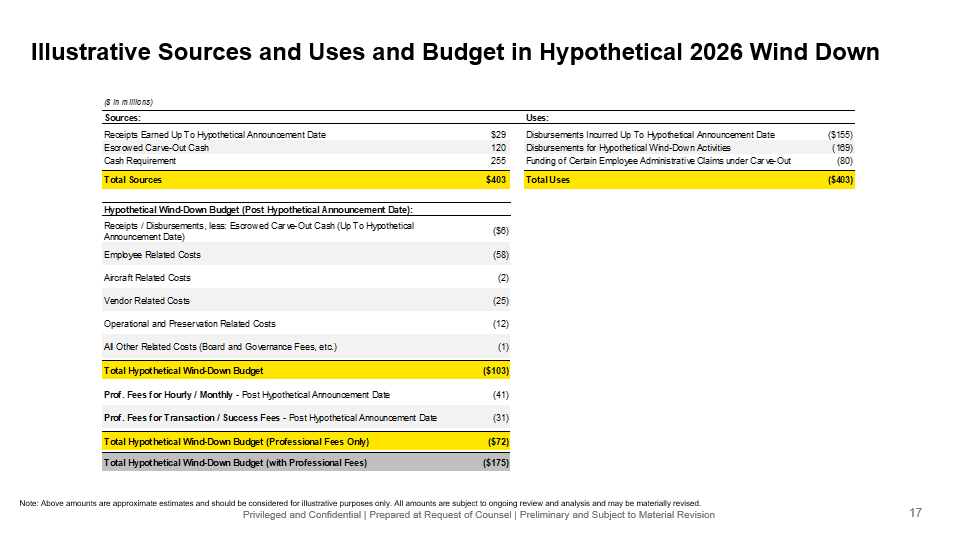 Privileged and Confidential | Prepared at Request of Counsel | Preliminary and Subject to Material Revision Illustrative Sources and Uses and Budget in Hypothetical 2026 Wind Down ($ in millions) Sources: Uses: Receipts Earned Up To Hypothetical Announcement Date $29 Disbursements Incurred Up To Hypothetical Announcement Date ($155) Escrowed Carve-Out Cash 120 Disbursements for Hypothetical Wind-Down Activities (169) Cash Requirement 255 Funding of Certain Employee Administrative Claims under Carve-Out (80) Total Sources $403 Total Uses ($403) Hypothetical Wind-Down Budget (Post Hypothetical Announcement Date): Receipts / Disbursements, less: Escrowed Carve-Out Cash (Up To Hypothetical Announcement Date) ($6) Employee Related Costs (58) Aircraft Related Costs (2) Vendor Related Costs (25) Operational and Preservation Related Costs (12) All Other Related Costs (Board and Governance Fees, etc.) (1) Total Hypothetical Wind-Down Budget ($103) Prof. Fees for Hourly / Monthly - Post Hypothetical Announcement Date (41) Prof. Fees for Transaction / Success Fees - Post Hypothetical Announcement Date (31) Total Hypothetical Wind-Down Budget (Professional Fees Only) ($72) Total Hypothetical Wind-Down Budget (with Professional Fees) ($175) Note : Above amounts are approximate estimates and should be considered for illustrative purposes only. All amounts are subject to on going review and analysis and may be materially revised. 17