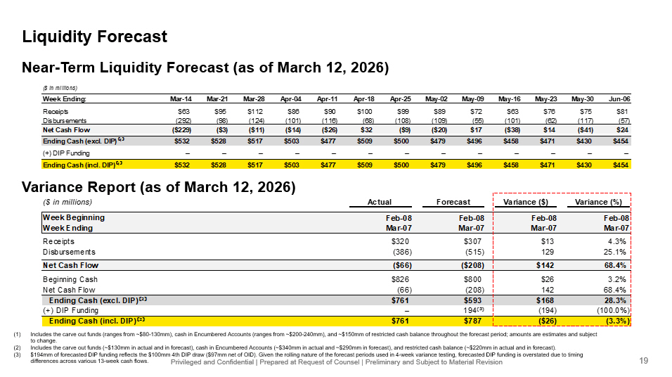 Privileged and Confidential | Prepared at Request of Counsel | Preliminary and Subject to Material Revision (1) Includes the carve out funds (ranges from ~$80 - 130mm), cash in Encumbered Accounts (ranges from ~$200 - 240mm), and ~$150mm of res tricted cash balance throughout the forecast period; amounts are estimates and subject to change. (2) Includes the carve out funds (~$130mm in actual and in forecast), cash in Encumbered Accounts (~$340mm in actual and ~$290mm in forecast), and restricted cash balance (~$220mm in actual and in forecast). (3) $194mm of forecasted DIP funding reflects the $100mm 4th DIP draw ($97mm net of OID). Given the rolling nature of the forecas t p eriods used in 4 - week variance testing, forecasted DIP funding is overstated due to timing differences across various 13 - week cash flows. Liquidity Forecast ($ in millions) Week Ending: Mar-14 Mar-21 Mar-28 Apr-04 Apr-11 Apr-18 Apr-25 May-02 May-09 May-16 May-23 May-30 Jun-06 Receipts $63 $95 $112 $86 $90 $100 $99 $89 $72 $63 $76 $75 $81 Disbursements (292) (98) (124) (101) (116) (68) (108) (109) (55) (101) (62) (117) (57) Net Cash Flow ($229) ($3) ($11) ($14) ($26) $32 ($9) ($20) $17 ($38) $14 ($41) $24 Ending Cash (excl. DIP) ⁽ ¹ ⁾ $532 $528 $517 $503 $477 $509 $500 $479 $496 $458 $471 $430 $454 (+) DIP Funding – – – – – – – – – – – – – Ending Cash (incl. DIP) ⁽ ¹ ⁾ $532 $528 $517 $503 $477 $509 $500 $479 $496 $458 $471 $430 $454 Near - Term Liquidity Forecast (as of March 12, 2026) ($ in millions) Actual Forecast Variance ($) Variance (%) Week Beginning Feb-08 Feb-08 Feb-08 Feb-08 Week Ending Mar-07 Mar-07 Mar-07 Mar-07 Receipts $320 $307 $13 4.3% Disbursements (386) (515) 129 25.1% – Net Cash Flow ($66) ($208) $142 68.4% – Beginning Cash $826 $800 $26 3.2% Net Cash Flow (66) (208) 142 68.4% Ending Cash (excl. DIP) ⁽ ² ⁾ $761 $593 $168 28.3% (+) DIP Funding – 194 ⁽ ³ ⁾ (194) (100.0%) Ending Cash (incl. DIP) ⁽ ² ⁾ $761 $787 ($26) (3.3%) Variance Report (as of March 12 , 2026) 19