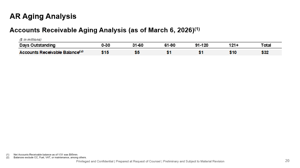 Privileged and Confidential | Prepared at Request of Counsel | Preliminary and Subject to Material Revision (1) Net Accounts Receivable balance as of 1/31 was $95mm. (2) Balances exclude CC, Fuel, VAT, or maintenance, among others. AR Aging Analysis ($ in millions) Days Outstanding 0-30 31-60 61-90 91-120 121+ Total Accounts Receivable Balance ⁽ ² ⁾ $15 $5 $1 $1 $10 $32 Accounts Receivable Aging Analysis (as of March 6 , 2026) (1) 20