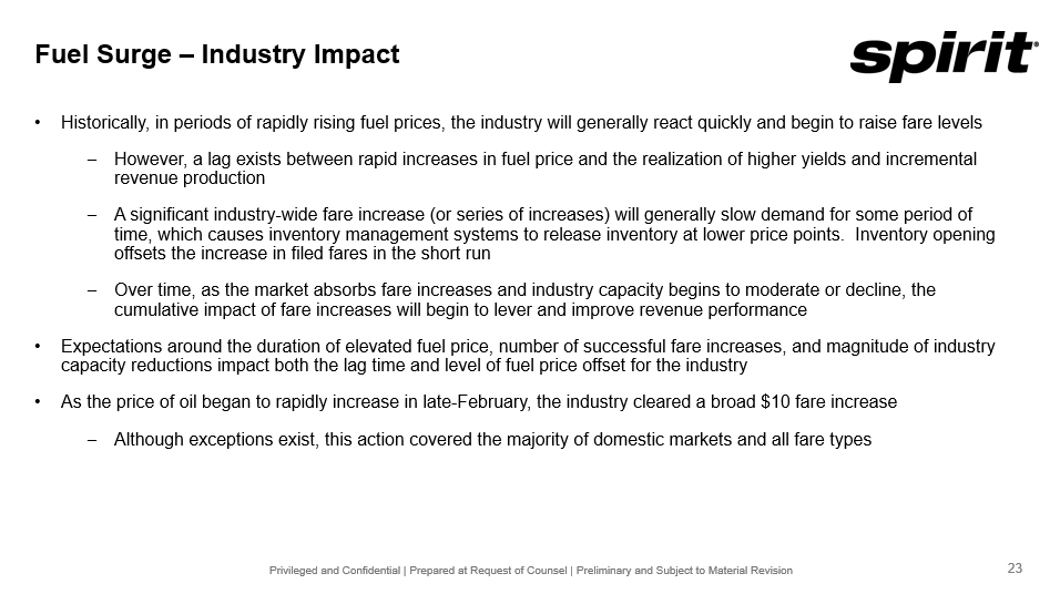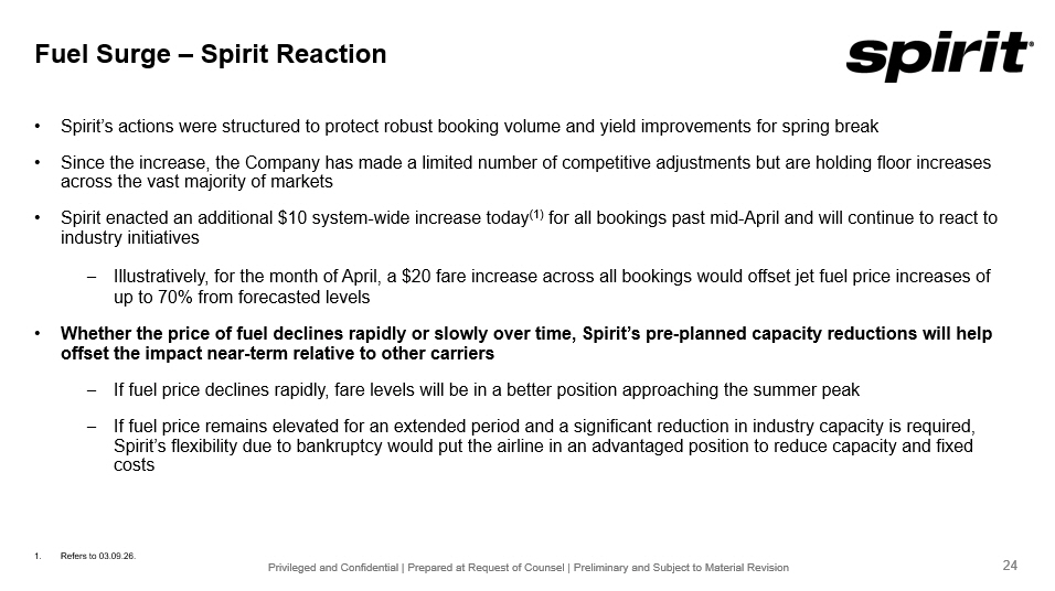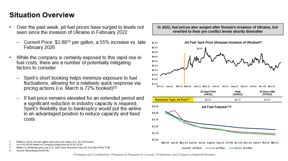 Privileged and Confidential | Prepared at Request of Counsel | Preliminary and Subject to Material Revision $2.00 $2.50 $3.00 $3.50 $4.00 $4.50 Mar-26 Apr-26 May-26 Jun-26 Jul-26 Aug-26 Sep-26 Oct-26 Nov-26 Dec-26 Jan-27 Feb-27 Mar-27 NY Jet Fuel LA Jet Fuel USGC Jet Fuel $5.07 $1.00 $1.50 $2.00 $2.50 $3.00 $3.50 $4.00 $4.50 $5.00 $5.50 Dec-21 Jan-22 Feb-22 Mar-22 Apr-22 May-22 Jun-22 Jul-22 Aug-22 Sep-22 Oct-22 Nov-22 Dec-22 Situation Overview • Over the past week, jet fuel prices have surged to levels not seen since the invasion of Ukraine in February 2022 – Current Price: $3.88 (1) per gallon, a 55% increase vs. late February 2026 • While the company is certainly exposed to this rapid rise in fuel costs, there are a number of potentially mitigating factors to consider – Spirit’s short booking helps minimize exposure to fuel fluctuations, allowing for a relatively quick response via pricing actions (i.e. March is 72% booked) (2) – If fuel price remains elevated for an extended period and a significant reduction in industry capacity is required, Spirit’s flexibility due to bankruptcy would put the airline in an advantaged position to reduce capacity and fixed costs 20 Days After (5/18/22) Peak (4/28/22) 20 Days Prior (4/8/22) $3.47 $5.07 $3.41 Kerosene - Type Jet Fuel (3) Jet Fuel Futures (1)(4) Jet Fuel Spot Price (Russian Invasion of Ukraine) (3) 1. Refers to all - in cost per gallon (spot price per Argus U.S. Jet Fuel Index). 2. As of 03.09.26 based on Company projections as of 02.19.26. 3. Refers to wholesale price, per U.S. Gulf Coast Kerosene - Type Jet Fuel Spot Price FOB. 4. Source: Bloomberg (03.09.26). In 2022, fuel prices also surged after Russia’s invasion of Ukraine, but reverted to their pre - conflict levels shortly thereafter
