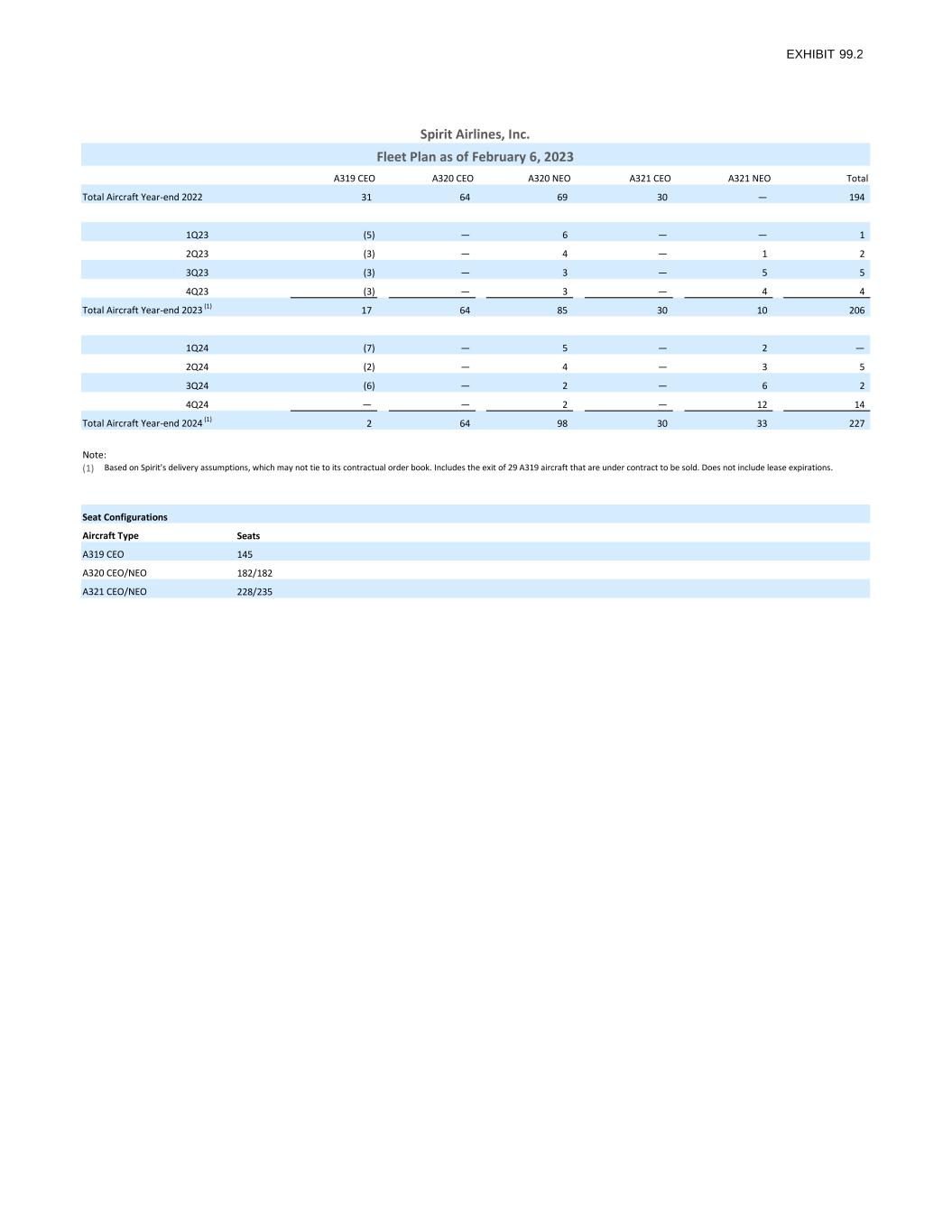 A319 CEO A320 CEO A320 NEO A321 CEO A321 NEO Total 31 64 69 30 — 194 1Q23 (5) — 6 — — 1 2Q23 (3) — 4 — 1 2 3Q23 (3) — 3 — 5 5 4Q23 (3) — 3 — 4 4 17 64 85 30 10 206 1Q24 (7) — 5 — 2 — 2Q24 (2) — 4 — 3 5 3Q24 (6) — 2 — 6 2 4Q24 — — 2 — 12 14 2 64 98 30 33 227 Note: (1) Seat Configurations Seats 145 182/182 228/235 Spirit Airlines, Inc. Fleet Plan as of February 6, 2023 A321 CEO/NEO Total Aircraft Year-end 2022 Total Aircraft Year-end 2023 (1) Aircraft Type A319 CEO Total Aircraft Year-end 2024 (1) A320 CEO/NEO Based on Spirit's delivery assumptions, which may not tie to its contractual order book. Includes the exit of 29 A319 aircraft that are under contract to be sold. Does not include lease expirations.