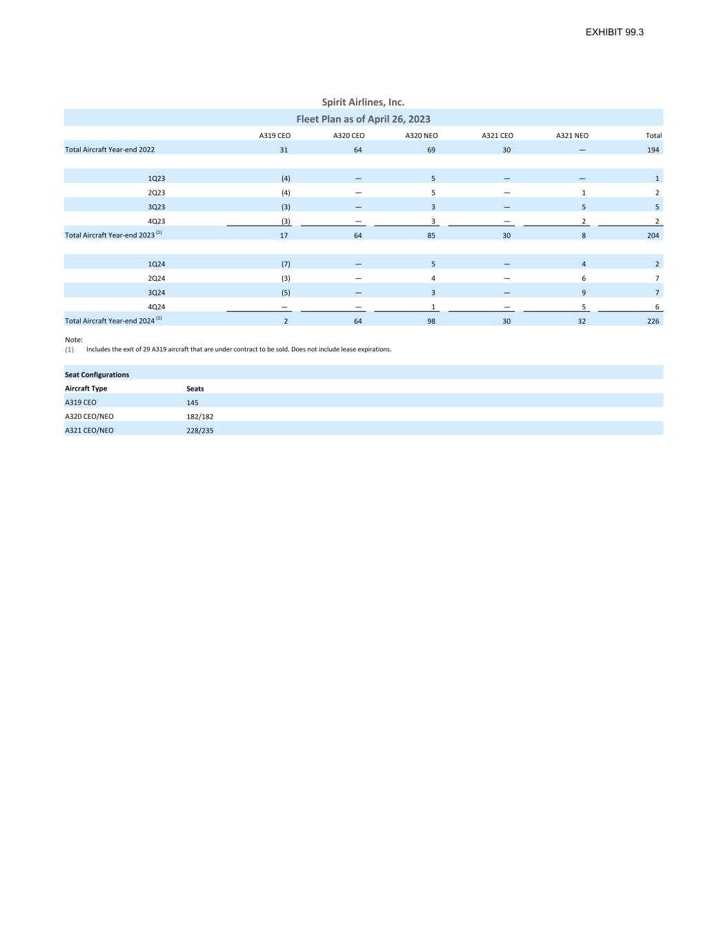A319 CEO A320 CEO A320 NEO A321 CEO A321 NEO Total 31 64 69 30 — 194 1Q23 (4) — 5 — — 1 2Q23 (4) — 5 — 1 2 3Q23 (3) — 3 — 5 5 4Q23 (3) — 3 — 2 2 17 64 85 30 8 204 1Q24 (7) — 5 — 4 2 2Q24 (3) — 4 — 6 7 3Q24 (5) — 3 — 9 7 4Q24 — — 1 — 5 6 2 64 98 30 32 226 Note: (1) Seat Configurations Seats 145 182/182 228/235 Spirit Airlines, Inc. Fleet Plan as of April 26, 2023 A321 CEO/NEO Total Aircraft Year-end 2022 Total Aircraft Year-end 2023 (1) Aircraft Type A319 CEO Total Aircraft Year-end 2024 (1) A320 CEO/NEO Includes the exit of 29 A319 aircraft that are under contract to be sold. Does not include lease expirations.