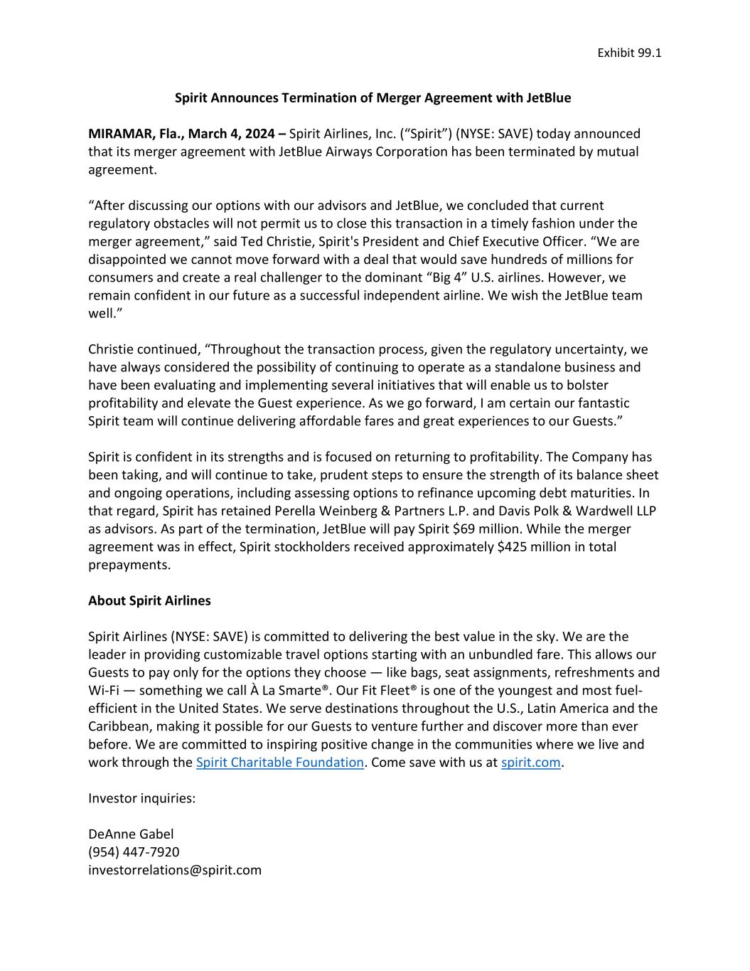 Exhibit 99.1 Spirit Announces Termination of Merger Agreement with JetBlue MIRAMAR, Fla., March 4, 2024 – Spirit Airlines, Inc. (“Spirit”) (NYSE: SAVE) today announced that its merger agreement with JetBlue Airways Corporation has been terminated by mutual agreement. “After discussing our options with our advisors and JetBlue, we concluded that current regulatory obstacles will not permit us to close this transaction in a timely fashion under the merger agreement,” said Ted Christie, Spirit's President and Chief Executive Officer. “We are disappointed we cannot move forward with a deal that would save hundreds of millions for consumers and create a real challenger to the dominant “Big 4” U.S. airlines. However, we remain confident in our future as a successful independent airline. We wish the JetBlue team well.” Christie continued, “Throughout the transaction process, given the regulatory uncertainty, we have always considered the possibility of continuing to operate as a standalone business and have been evaluating and implementing several initiatives that will enable us to bolster profitability and elevate the Guest experience. As we go forward, I am certain our fantastic Spirit team will continue delivering affordable fares and great experiences to our Guests.” Spirit is confident in its strengths and is focused on returning to profitability. The Company has been taking, and will continue to take, prudent steps to ensure the strength of its balance sheet and ongoing operations, including assessing options to refinance upcoming debt maturities. In that regard, Spirit has retained Perella Weinberg & Partners L.P. and Davis Polk & Wardwell LLP as advisors. As part of the termination, JetBlue will pay Spirit $69 million. While the merger agreement was in effect, Spirit stockholders received approximately $425 million in total prepayments. About Spirit Airlines Spirit Airlines (NYSE: SAVE) is committed to delivering the best value in the sky. We are the leader in providing customizable travel options starting with an unbundled fare. This allows our Guests to pay only for the options they choose — like bags, seat assignments, refreshments and Wi-Fi — something we call À La Smarte®. Our Fit Fleet® is one of the youngest and most fuel- efficient in the United States. We serve destinations throughout the U.S., Latin America and the Caribbean, making it possible for our Guests to venture further and discover more than ever before. We are committed to inspiring positive change in the communities where we live and work through the Spirit Charitable Foundation. Come save with us at spirit.com. Investor inquiries: DeAnne Gabel (954) 447-7920 investorrelations@spirit.com