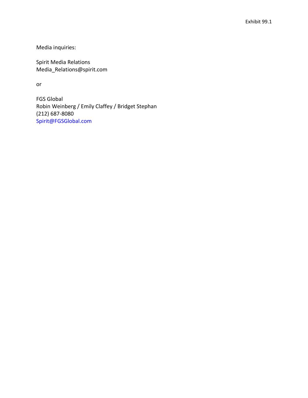 Exhibit 99.1 Media inquiries: Spirit Media Relations Media_Relations@spirit.com or FGS Global Robin Weinberg / Emily Claffey / Bridget Stephan (212) 687-8080 Spirit@FGSGlobal.com