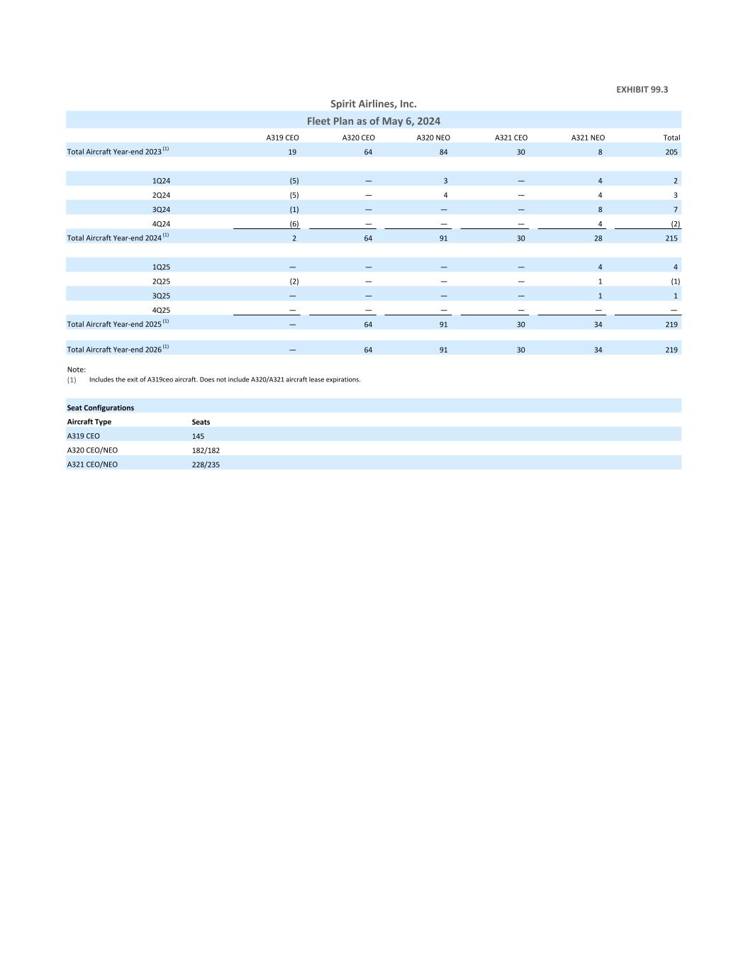 EXHIBIT 99.3 A319 CEO A320 CEO A320 NEO A321 CEO A321 NEO Total 19 64 84 30 8 205 1Q24 (5) — 3 — 4 2 2Q24 (5) — 4 — 4 3 3Q24 (1) — — — 8 7 4Q24 (6) — — — 4 (2) 2 64 91 30 28 215 1Q25 — — — — 4 4 2Q25 (2) — — — 1 (1) 3Q25 — — — — 1 1 4Q25 — — — — — — — 64 91 30 34 219 — 64 91 30 34 219 Note: (1) Seat Configurations Seats 145 182/182 228/235 Spirit Airlines, Inc. Fleet Plan as of May 6, 2024 A321 CEO/NEO Total Aircraft Year-end 2023 (1) Total Aircraft Year-end 2024 (1) Aircraft Type A319 CEO Total Aircraft Year-end 2025 (1) A320 CEO/NEO Includes the exit of A319ceo aircraft. Does not include A320/A321 aircraft lease expirations. Total Aircraft Year-end 2026 (1)