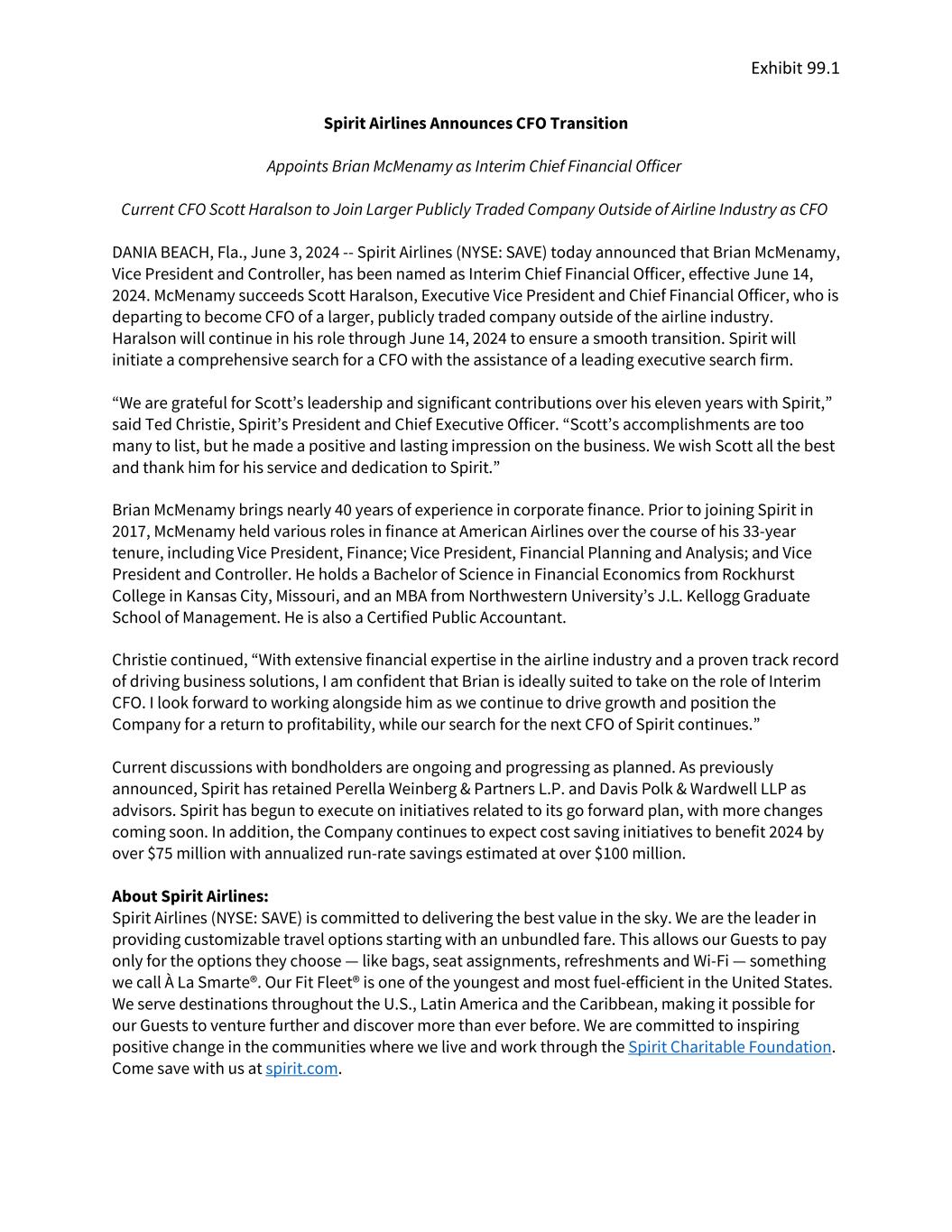 Exhibit 99.1 Spirit Airlines Announces CFO Transition Appoints Brian McMenamy as Interim Chief Financial Officer Current CFO Scott Haralson to Join Larger Publicly Traded Company Outside of Airline Industry as CFO DANIA BEACH, Fla., June 3, 2024 -- Spirit Airlines (NYSE: SAVE) today announced that Brian McMenamy, Vice President and Controller, has been named as Interim Chief Financial Officer, effective June 14, 2024. McMenamy succeeds Scott Haralson, Executive Vice President and Chief Financial Officer, who is departing to become CFO of a larger, publicly traded company outside of the airline industry. Haralson will continue in his role through June 14, 2024 to ensure a smooth transition. Spirit will initiate a comprehensive search for a CFO with the assistance of a leading executive search firm. “We are grateful for Scott’s leadership and significant contributions over his eleven years with Spirit,” said Ted Christie, Spirit’s President and Chief Executive Officer. “Scott’s accomplishments are too many to list, but he made a positive and lasting impression on the business. We wish Scott all the best and thank him for his service and dedication to Spirit.” Brian McMenamy brings nearly 40 years of experience in corporate finance. Prior to joining Spirit in 2017, McMenamy held various roles in finance at American Airlines over the course of his 33-year tenure, including Vice President, Finance; Vice President, Financial Planning and Analysis; and Vice President and Controller. He holds a Bachelor of Science in Financial Economics from Rockhurst College in Kansas City, Missouri, and an MBA from Northwestern University’s J.L. Kellogg Graduate School of Management. He is also a Certified Public Accountant. Christie continued, “With extensive financial expertise in the airline industry and a proven track record of driving business solutions, I am confident that Brian is ideally suited to take on the role of Interim CFO. I look forward to working alongside him as we continue to drive growth and position the Company for a return to profitability, while our search for the next CFO of Spirit continues.” Current discussions with bondholders are ongoing and progressing as planned. As previously announced, Spirit has retained Perella Weinberg & Partners L.P. and Davis Polk & Wardwell LLP as advisors. Spirit has begun to execute on initiatives related to its go forward plan, with more changes coming soon. In addition, the Company continues to expect cost saving initiatives to benefit 2024 by over $75 million with annualized run-rate savings estimated at over $100 million. About Spirit Airlines:  Spirit Airlines (NYSE: SAVE) is committed to delivering the best value in the sky. We are the leader in providing customizable travel options starting with an unbundled fare. This allows our Guests to pay only for the options they choose — like bags, seat assignments, refreshments and Wi-Fi — something we call À La Smarte®. Our Fit Fleet® is one of the youngest and most fuel-efficient in the United States. We serve destinations throughout the U.S., Latin America and the Caribbean, making it possible for our Guests to venture further and discover more than ever before. We are committed to inspiring positive change in the communities where we live and work through the Spirit Charitable Foundation. Come save with us at spirit.com.