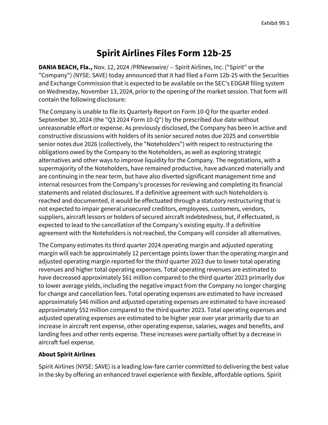 Exhibit 99.1 Spirit Airlines Files Form 12b-25 DANIA BEACH, Fla., Nov. 12, 2024 /PRNewswire/ -- Spirit Airlines, Inc. ("Spirit" or the "Company") (NYSE: SAVE) today announced that it had filed a Form 12b-25 with the Securities and Exchange Commission that is expected to be available on the SEC's EDGAR filing system on Wednesday, November 13, 2024, prior to the opening of the market session. That form will contain the following disclosure: The Company is unable to file its Quarterly Report on Form 10-Q for the quarter ended September 30, 2024 (the "Q3 2024 Form 10-Q") by the prescribed due date without unreasonable effort or expense. As previously disclosed, the Company has been in active and constructive discussions with holders of its senior secured notes due 2025 and convertible senior notes due 2026 (collectively, the "Noteholders") with respect to restructuring the obligations owed by the Company to the Noteholders, as well as exploring strategic alternatives and other ways to improve liquidity for the Company. The negotiations, with a supermajority of the Noteholders, have remained productive, have advanced materially and are continuing in the near term, but have also diverted significant management time and internal resources from the Company's processes for reviewing and completing its financial statements and related disclosures. If a definitive agreement with such Noteholders is reached and documented, it would be effectuated through a statutory restructuring that is not expected to impair general unsecured creditors, employees, customers, vendors, suppliers, aircraft lessors or holders of secured aircraft indebtedness, but, if effectuated, is expected to lead to the cancellation of the Company's existing equity. If a definitive agreement with the Noteholders is not reached, the Company will consider all alternatives. The Company estimates its third quarter 2024 operating margin and adjusted operating margin will each be approximately 12 percentage points lower than the operating margin and adjusted operating margin reported for the third quarter 2023 due to lower total operating revenues and higher total operating expenses. Total operating revenues are estimated to have decreased approximately $61 million compared to the third quarter 2023 primarily due to lower average yields, including the negative impact from the Company no longer charging for change and cancellation fees. Total operating expenses are estimated to have increased approximately $46 million and adjusted operating expenses are estimated to have increased approximately $52 million compared to the third quarter 2023. Total operating expenses and adjusted operating expenses are estimated to be higher year over year primarily due to an increase in aircraft rent expense, other operating expense, salaries, wages and benefits, and landing fees and other rents expense. These increases were partially offset by a decrease in aircraft fuel expense. About Spirit Airlines Spirit Airlines (NYSE: SAVE) is a leading low-fare carrier committed to delivering the best value in the sky by offering an enhanced travel experience with flexible, affordable options. Spirit