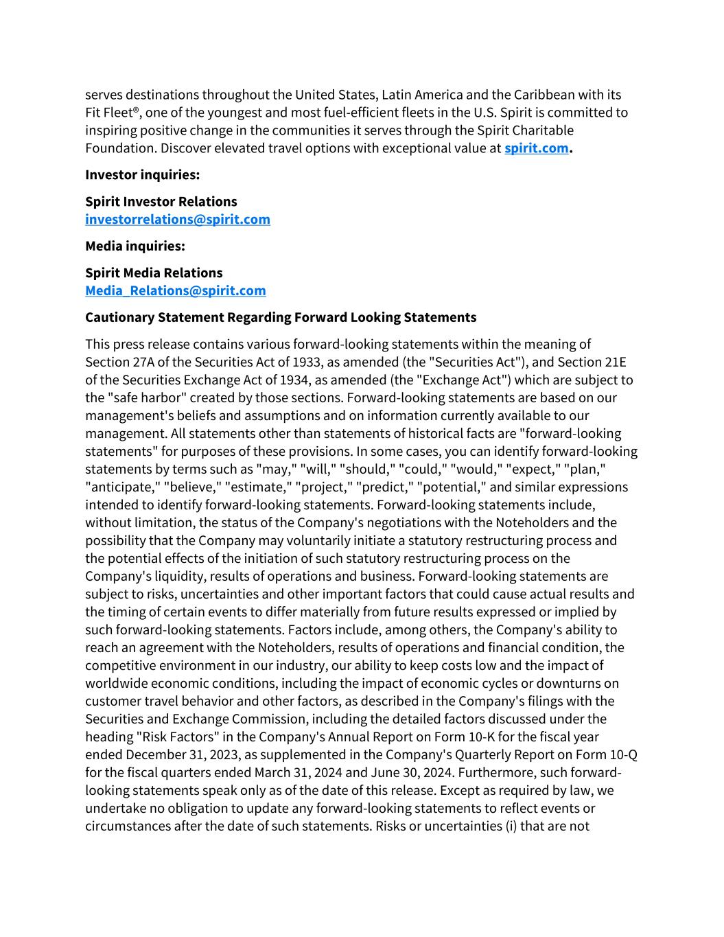 serves destinations throughout the United States, Latin America and the Caribbean with its Fit Fleet®, one of the youngest and most fuel-efficient fleets in the U.S. Spirit is committed to inspiring positive change in the communities it serves through the Spirit Charitable Foundation. Discover elevated travel options with exceptional value at spirit.com. Investor inquiries: Spirit Investor Relations investorrelations@spirit.com Media inquiries: Spirit Media Relations Media_Relations@spirit.com Cautionary Statement Regarding Forward Looking Statements This press release contains various forward-looking statements within the meaning of Section 27A of the Securities Act of 1933, as amended (the "Securities Act"), and Section 21E of the Securities Exchange Act of 1934, as amended (the "Exchange Act") which are subject to the "safe harbor" created by those sections. Forward-looking statements are based on our management's beliefs and assumptions and on information currently available to our management. All statements other than statements of historical facts are "forward-looking statements" for purposes of these provisions. In some cases, you can identify forward-looking statements by terms such as "may," "will," "should," "could," "would," "expect," "plan," "anticipate," "believe," "estimate," "project," "predict," "potential," and similar expressions intended to identify forward-looking statements. Forward-looking statements include, without limitation, the status of the Company's negotiations with the Noteholders and the possibility that the Company may voluntarily initiate a statutory restructuring process and the potential effects of the initiation of such statutory restructuring process on the Company's liquidity, results of operations and business. Forward-looking statements are subject to risks, uncertainties and other important factors that could cause actual results and the timing of certain events to differ materially from future results expressed or implied by such forward-looking statements. Factors include, among others, the Company's ability to reach an agreement with the Noteholders, results of operations and financial condition, the competitive environment in our industry, our ability to keep costs low and the impact of worldwide economic conditions, including the impact of economic cycles or downturns on customer travel behavior and other factors, as described in the Company's filings with the Securities and Exchange Commission, including the detailed factors discussed under the heading "Risk Factors" in the Company's Annual Report on Form 10-K for the fiscal year ended December 31, 2023, as supplemented in the Company's Quarterly Report on Form 10-Q for the fiscal quarters ended March 31, 2024 and June 30, 2024. Furthermore, such forward- looking statements speak only as of the date of this release. Except as required by law, we undertake no obligation to update any forward-looking statements to reflect events or circumstances after the date of such statements. Risks or uncertainties (i) that are not