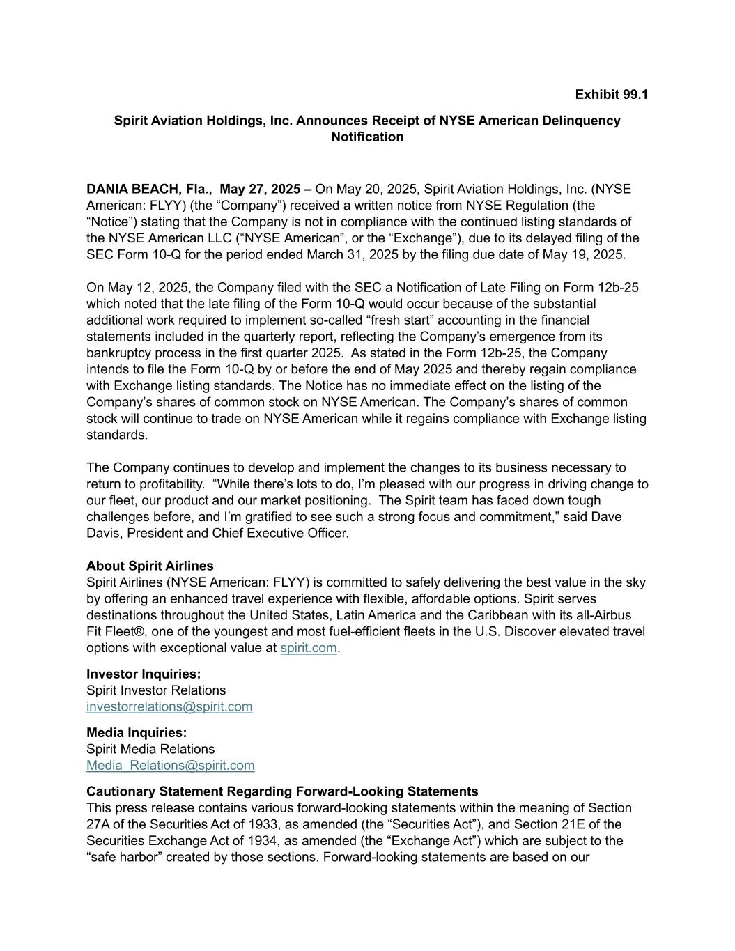 Exhibit 99.1 Spirit Aviation Holdings, Inc. Announces Receipt of NYSE American Delinquency Notification DANIA BEACH, Fla., May 27, 2025 – On May 20, 2025, Spirit Aviation Holdings, Inc. (NYSE American: FLYY) (the “Company”) received a written notice from NYSE Regulation (the “Notice”) stating that the Company is not in compliance with the continued listing standards of the NYSE American LLC (“NYSE American”, or the “Exchange”), due to its delayed filing of the SEC Form 10-Q for the period ended March 31, 2025 by the filing due date of May 19, 2025. On May 12, 2025, the Company filed with the SEC a Notification of Late Filing on Form 12b-25 which noted that the late filing of the Form 10-Q would occur because of the substantial additional work required to implement so-called “fresh start” accounting in the financial statements included in the quarterly report, reflecting the Company’s emergence from its bankruptcy process in the first quarter 2025. As stated in the Form 12b-25, the Company intends to file the Form 10-Q by or before the end of May 2025 and thereby regain compliance with Exchange listing standards. The Notice has no immediate effect on the listing of the Company’s shares of common stock on NYSE American. The Company’s shares of common stock will continue to trade on NYSE American while it regains compliance with Exchange listing standards. The Company continues to develop and implement the changes to its business necessary to return to profitability. “While there’s lots to do, I’m pleased with our progress in driving change to our fleet, our product and our market positioning. The Spirit team has faced down tough challenges before, and I’m gratified to see such a strong focus and commitment,” said Dave Davis, President and Chief Executive Officer. About Spirit Airlines Spirit Airlines (NYSE American: FLYY) is committed to safely delivering the best value in the sky by offering an enhanced travel experience with flexible, affordable options. Spirit serves destinations throughout the United States, Latin America and the Caribbean with its all-Airbus Fit Fleet®, one of the youngest and most fuel-efficient fleets in the U.S. Discover elevated travel options with exceptional value at spirit.com. Investor Inquiries: Spirit Investor Relations investorrelations@spirit.com Media Inquiries: Spirit Media Relations Media_Relations@spirit.com Cautionary Statement Regarding Forward-Looking Statements This press release contains various forward-looking statements within the meaning of Section 27A of the Securities Act of 1933, as amended (the “Securities Act”), and Section 21E of the Securities Exchange Act of 1934, as amended (the “Exchange Act”) which are subject to the “safe harbor” created by those sections. Forward-looking statements are based on our