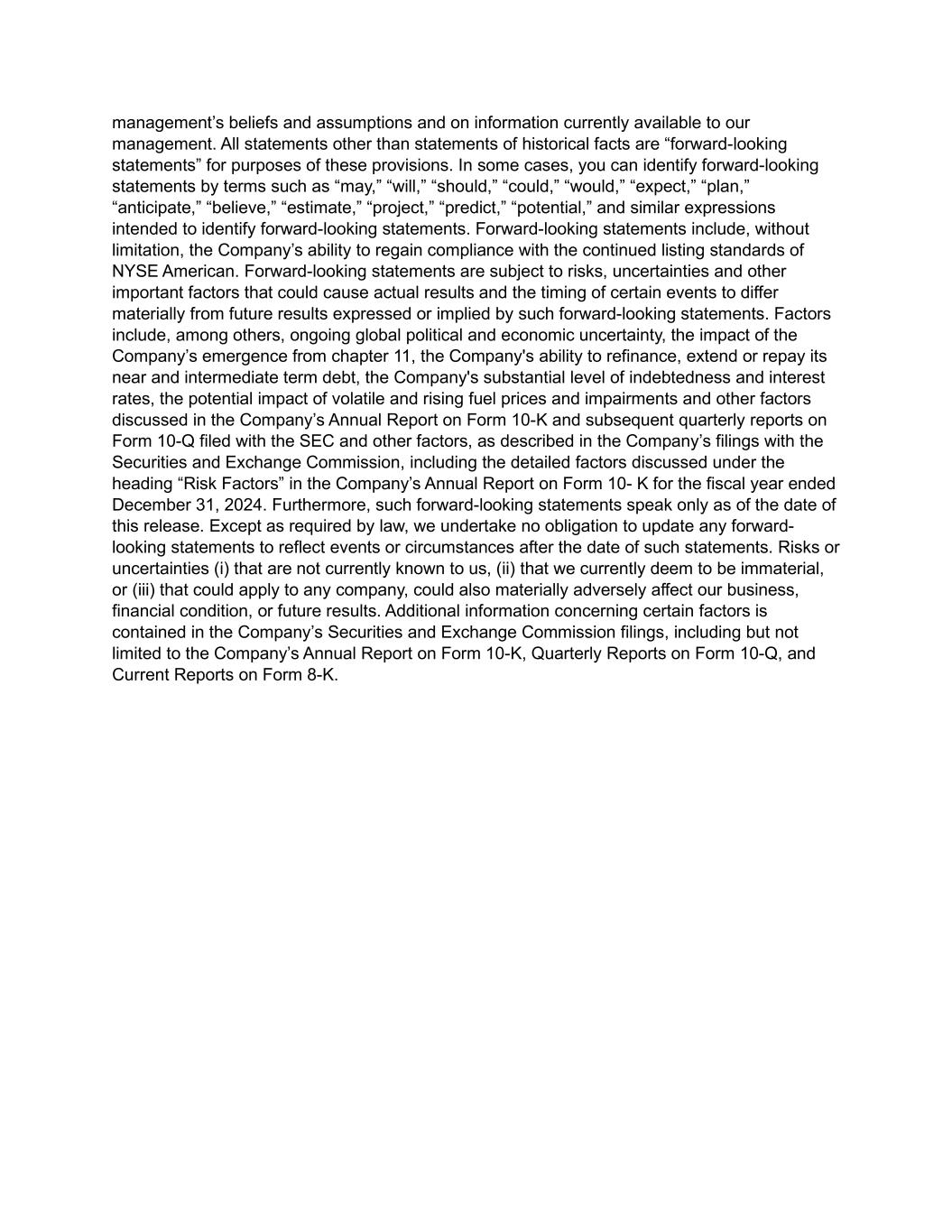 management’s beliefs and assumptions and on information currently available to our management. All statements other than statements of historical facts are “forward-looking statements” for purposes of these provisions. In some cases, you can identify forward-looking statements by terms such as “may,” “will,” “should,” “could,” “would,” “expect,” “plan,” “anticipate,” “believe,” “estimate,” “project,” “predict,” “potential,” and similar expressions intended to identify forward-looking statements. Forward-looking statements include, without limitation, the Company’s ability to regain compliance with the continued listing standards of NYSE American. Forward-looking statements are subject to risks, uncertainties and other important factors that could cause actual results and the timing of certain events to differ materially from future results expressed or implied by such forward-looking statements. Factors include, among others, ongoing global political and economic uncertainty, the impact of the Company’s emergence from chapter 11, the Company's ability to refinance, extend or repay its near and intermediate term debt, the Company's substantial level of indebtedness and interest rates, the potential impact of volatile and rising fuel prices and impairments and other factors discussed in the Company’s Annual Report on Form 10-K and subsequent quarterly reports on Form 10-Q filed with the SEC and other factors, as described in the Company’s filings with the Securities and Exchange Commission, including the detailed factors discussed under the heading “Risk Factors” in the Company’s Annual Report on Form 10- K for the fiscal year ended December 31, 2024. Furthermore, such forward-looking statements speak only as of the date of this release. Except as required by law, we undertake no obligation to update any forward- looking statements to reflect events or circumstances after the date of such statements. Risks or uncertainties (i) that are not currently known to us, (ii) that we currently deem to be immaterial, or (iii) that could apply to any company, could also materially adversely affect our business, financial condition, or future results. Additional information concerning certain factors is contained in the Company’s Securities and Exchange Commission filings, including but not limited to the Company’s Annual Report on Form 10-K, Quarterly Reports on Form 10-Q, and Current Reports on Form 8-K.