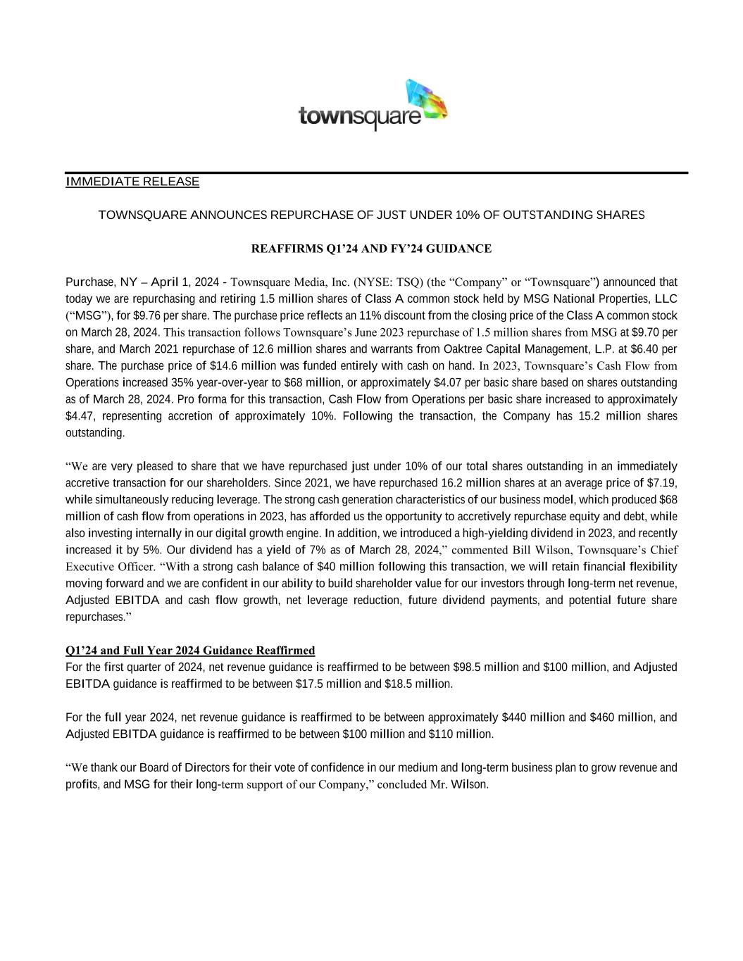 IMMEDIATE RELEASE TOWNSQUARE ANNOUNCES REPURCHASE OF JUST UNDER 10% OF OUTSTANDING SHARES REAFFIRMS Q1’24 AND FY’24 GUIDANCE Purchase, NY – April 1, 2024 - Townsquare Media, Inc. (NYSE: TSQ) (the “Company” or “Townsquare”) announced that today we are repurchasing and retiring 1.5 million shares of Class A common stock held by MSG National Properties, LLC (“MSG”), for $9.76 per share. The purchase price reflects an 11% discount from the closing price of the Class A common stock on March 28, 2024. This transaction follows Townsquare’s June 2023 repurchase of 1.5 million shares from MSG at $9.70 per share, and March 2021 repurchase of 12.6 million shares and warrants from Oaktree Capital Management, L.P. at $6.40 per share. The purchase price of $14.6 million was funded entirely with cash on hand. In 2023, Townsquare’s Cash Flow from Operations increased 35% year-over-year to $68 million, or approximately $4.07 per basic share based on shares outstanding as of March 28, 2024. Pro forma for this transaction, Cash Flow from Operations per basic share increased to approximately $4.47, representing accretion of approximately 10%. Following the transaction, the Company has 15.2 million shares outstanding. “We are very pleased to share that we have repurchased just under 10% of our total shares outstanding in an immediately accretive transaction for our shareholders. Since 2021, we have repurchased 16.2 million shares at an average price of $7.19, while simultaneously reducing leverage. The strong cash generation characteristics of our business model, which produced $68 million of cash flow from operations in 2023, has afforded us the opportunity to accretively repurchase equity and debt, while also investing internally in our digital growth engine. In addition, we introduced a high-yielding dividend in 2023, and recently increased it by 5%. Our dividend has a yield of 7% as of March 28, 2024,” commented Bill Wilson, Townsquare’s Chief Executive Officer. “With a strong cash balance of $40 million following this transaction, we will retain financial flexibility moving forward and we are confident in our ability to build shareholder value for our investors through long-term net revenue, Adjusted EBITDA and cash flow growth, net leverage reduction, future dividend payments, and potential future share repurchases.” Q1’24 and Full Year 2024 Guidance Reaffirmed For the first quarter of 2024, net revenue guidance is reaffirmed to be between $98.5 million and $100 million, and Adjusted EBITDA guidance is reaffirmed to be between $17.5 million and $18.5 million. For the full year 2024, net revenue guidance is reaffirmed to be between approximately $440 million and $460 million, and Adjusted EBITDA guidance is reaffirmed to be between $100 million and $110 million. “We thank our Board of Directors for their vote of confidence in our medium and long-term business plan to grow revenue and profits, and MSG for their long-term support of our Company,” concluded Mr. Wilson.
