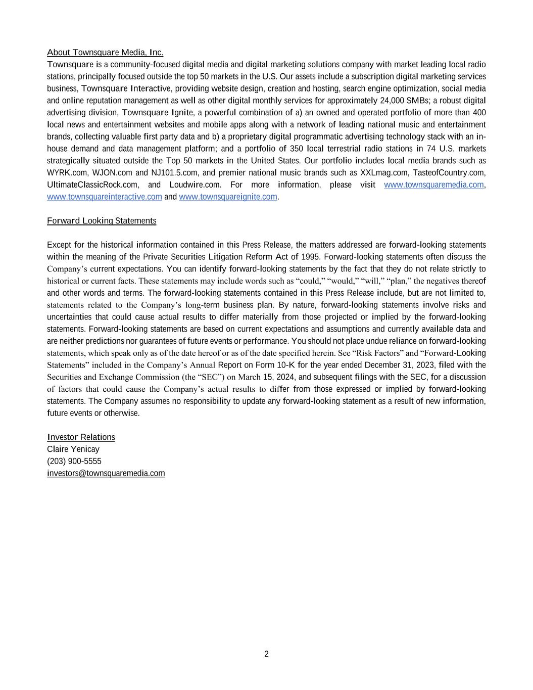 2 About Townsquare Media, Inc. Townsquare is a community-focused digital media and digital marketing solutions company with market leading local radio stations, principally focused outside the top 50 markets in the U.S. Our assets include a subscription digital marketing services business, Townsquare Interactive, providing website design, creation and hosting, search engine optimization, social media and online reputation management as well as other digital monthly services for approximately 24,000 SMBs; a robust digital advertising division, Townsquare Ignite, a powerful combination of a) an owned and operated portfolio of more than 400 local news and entertainment websites and mobile apps along with a network of leading national music and entertainment brands, collecting valuable first party data and b) a proprietary digital programmatic advertising technology stack with an in- house demand and data management platform; and a portfolio of 350 local terrestrial radio stations in 74 U.S. markets strategically situated outside the Top 50 markets in the United States. Our portfolio includes local media brands such as WYRK.com, WJON.com and NJ101.5.com, and premier national music brands such as XXLmag.com, TasteofCountry.com, UltimateClassicRock.com, and Loudwire.com. For more information, please visit www.townsquaremedia.com, www.townsquareinteractive.com and www.townsquareignite.com. Forward Looking Statements Except for the historical information contained in this Press Release, the matters addressed are forward-looking statements within the meaning of the Private Securities Litigation Reform Act of 1995. Forward-looking statements often discuss the Company’s current expectations. You can identify forward-looking statements by the fact that they do not relate strictly to historical or current facts. These statements may include words such as “could,” “would,” “will,” “plan,” the negatives thereof and other words and terms. The forward-looking statements contained in this Press Release include, but are not limited to, statements related to the Company’s long-term business plan. By nature, forward-looking statements involve risks and uncertainties that could cause actual results to differ materially from those projected or implied by the forward-looking statements. Forward-looking statements are based on current expectations and assumptions and currently available data and are neither predictions nor guarantees of future events or performance. You should not place undue reliance on forward-looking statements, which speak only as of the date hereof or as of the date specified herein. See “Risk Factors” and “Forward-Looking Statements” included in the Company’s Annual Report on Form 10-K for the year ended December 31, 2023, filed with the Securities and Exchange Commission (the “SEC”) on March 15, 2024, and subsequent filings with the SEC, for a discussion of factors that could cause the Company’s actual results to differ from those expressed or implied by forward-looking statements. The Company assumes no responsibility to update any forward-looking statement as a result of new information, future events or otherwise. Investor Relations Claire Yenicay (203) 900-5555 investors@townsquaremedia.com