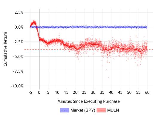 97.            Defendants’ fraudulent trading activities had both a temporary and long-term adverse effect on the market price of Mullen shares. As discussed above, the artificially depressed price resulting from any given Spoofing Episode may not fully recover to the price that existed prior to the Spoofing Episode. And when spoofing events occur continuously throughout the day and continue without interruption over a protracted period of time, the long-term cumulative effect of spoofing places enormous downward pressure on the market price of a security, which is persistent and long-lasting.