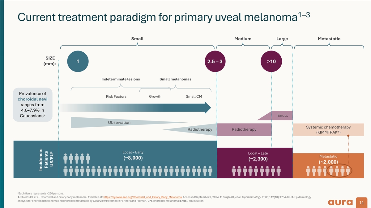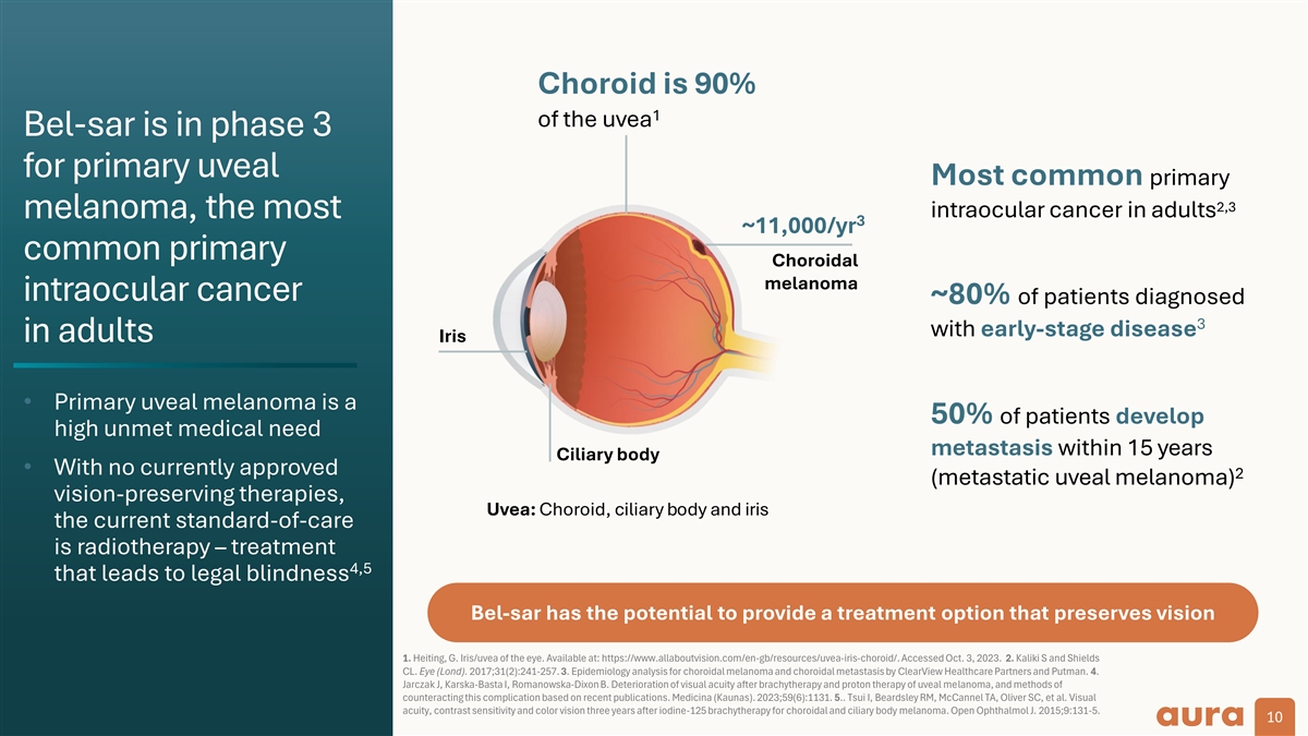 Choroid is 90% 1 of the uvea Bel-sar is in phase 3 for primary uveal Most common primary 2,3 melanoma, the most intraocular cancer in adults 3 ~11,000/yr common primary Choroidal melanoma intraocular cancer ~80% of patients diagnosed 3 with early-stage disease in adults Iris • Primary uveal melanoma is a 50% of patients develop high unmet medical need metastasis within 15 years Ciliary body • With no currently approved 2 (metastatic uveal melanoma) vision-preserving therapies, Uvea: Choroid, ciliary body and iris the current standard-of-care is radiotherapy – treatment 4,5 that leads to legal blindness Bel-sar has the potential to provide a treatment option that preserves vision 1. Heiting, G. Iris/uvea of the eye. Available at: https://www.allaboutvision.com/en-gb/resources/uvea-iris-choroid/. Accessed Oct. 3, 2023. 2. Kaliki S and Shields CL. Eye (Lond). 2017;31(2):241-257. 3. Epidemiology analysis for choroidal melanoma and choroidal metastasis by ClearView Healthcare Partners and Putman. 4. Jarczak J, Karska-Basta I, Romanowska-Dixon B. Deterioration of visual acuity after brachytherapy and proton therapy of uveal melanoma, and methods of counteracting this complication based on recent publications. Medicina (Kaunas). 2023;59(6):1131. 5.. Tsui I, Beardsley RM, McCannel TA, Oliver SC, et al. Visual acuity, contrast sensitivity and color vision three years after iodine-125 brachytherapy for choroidal and ciliary body melanoma. Open Ophthalmol J. 2015;9:131-5. 10