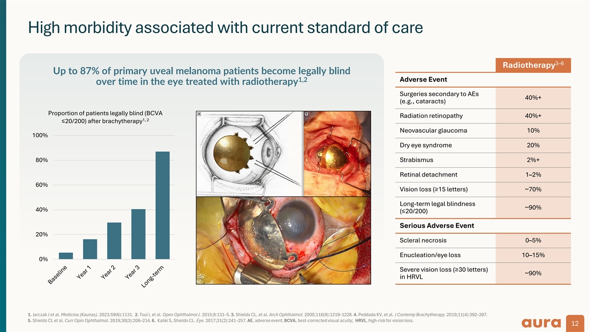 High morbidity associated with current standard of care 3–6 Radiotherapy Up to 87% of primary uveal melanoma patients become legally blind 1,2 Adverse Event over time in the eye treated with radiotherapy Surgeries secondary to AEs 40%+ (e.g., cataracts) Proportion of patients legally blind (BCVA Radiation retinopathy 40%+ 1, 2 ≤20/200) after brachytherapy Neovascular glaucoma 10% 100% Dry eye syndrome 20% 80% Strabismus 2%+ Retinal detachment 1–2% 60% Vision loss (≥15 letters) ~70% Long-term legal blindness ~90% 40% (≤20/200) Serious Adverse Event 20% Scleral necrosis 0–5% Enucleation/eye loss 10–15% 0% Severe vision loss (≥30 letters) ~90% in HRVL 1. Jarczak J et al. Medicina (Kaunas). 2023;59(6):1131. 2. Tsui I, et al. Open Ophthalmol J. 2015;9:131–5. 3. Shields CL, et al. Arch Ophthalmol. 2000;118(9):1219–1228. 4. Peddada KV, et al. J Contemp Brachytherapy. 2019;11(4):392–397. 5. Shields CL et al. Curr Opin Ophthalmol. 2019;30(3):206–214. 6. Kaliki S, Shields CL. Eye. 2017;31(2):241–257. AE, adverse event; BCVA, best-corrected visual acuity; HRVL, high-risk for vision loss. 12