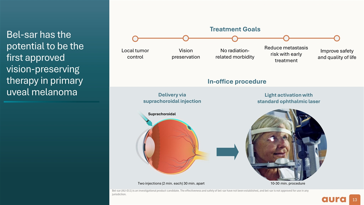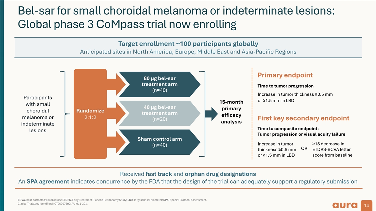Treatment Goals Bel-sar has the potential to be the Reduce metastasis Local tumor Vision No radiation- Improve safety risk with early related morbidity control preservation and quality of life first approved treatment vision-preserving In-office procedure therapy in primary uveal melanoma Delivery via Light activation with suprachoroidal injection standard ophthalmic laser Suprachoroidal Two injections (2 min. each) 30 min. apart 10-30 min. procedure Bel-sar (AU-011) is an investigational product candidate. The effectiveness and safety of bel-sar have not been established, and bel-sar is not approved for use in any jurisdiction. 13