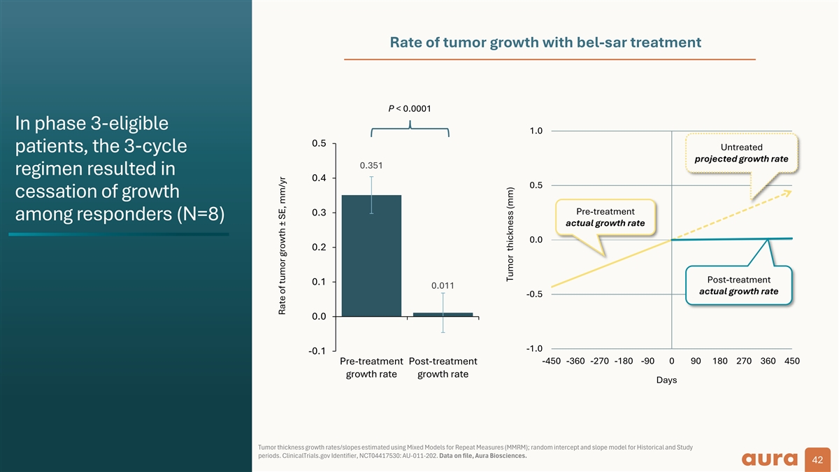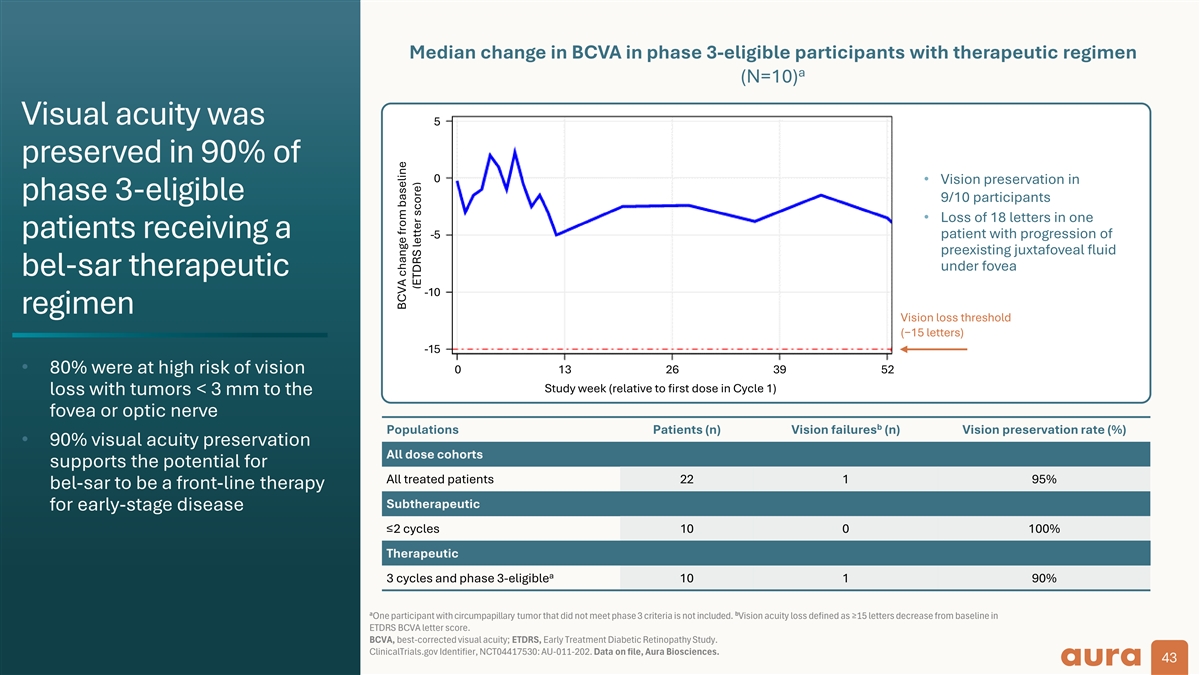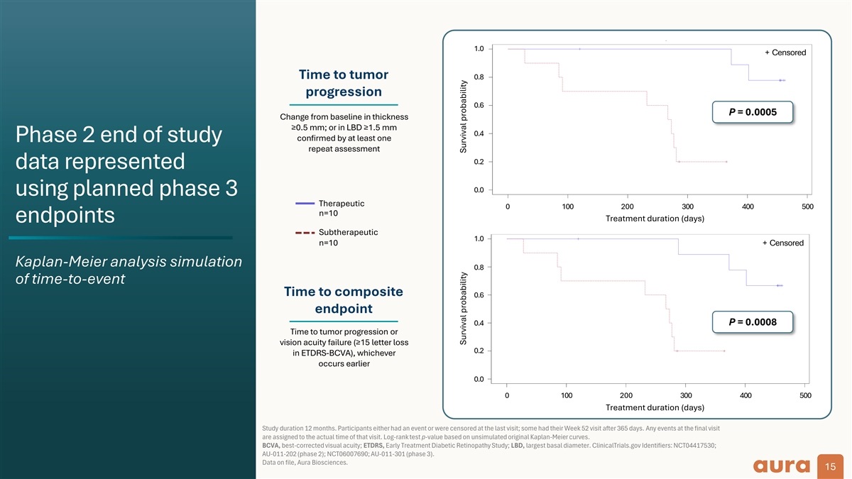 Product-Limit Survival Estimates With Number of Subjects at Risk 11 1 .0 ..0 0 + + C e Cn en ss oo re red d Time to tumor 00 0 .8 ..8 8 progression 00 0 .6 ..6 6 P = 0.0005 Change from baseline in thickness ≥0.5 mm; or in LBD ≥1.5 mm 0.4 0 0..4 4 confirmed by at least one Phase 2 end of study repeat assessment 00 0 .2 ..2 2 data represented 00 0 .0 ..0 0 using planned phase 3 Therapeutic 0 0 1 10 00 0 2 20 00 0 3 30 00 0 4 40 00 0 5 50 00 0 0 100 200 300 400 500 n=10 Product-Limit Survival Estimates Treatment duration (days) endpoints t td du ur rx x With Number of Subjects at Risk Subtherapeutic t tr rt tp p 3 3 C Cy yc cl le e 2 2 C Cy yc cl le e 11 1 .0 ..0 0 + Censored n=10 + Censored Kaplan-Meier analysis simulation 00 0 .8 ..8 8 10 10 9 9 8 0 3 Cycle 10 7 7 1 0 2 Cycle of time-to-event Time to composite 00 0 .6 ..6 6 endpoint 00 0 .4 ..4 4 P = 0.0008 Time to tumor progression or vision acuity failure (≥15 letter loss 0.2 0 0..2 2 in ETDRS-BCVA), whichever occurs earlier 00 0 .0 ..0 0 0 0 1 10 00 0 2 20 00 0 3 30 00 0 4 40 00 0 5 50 00 0 0 100 200 300 400 500 Treatment duration (days) t td du ur rx x t tr rt tp p 3 3 C Cy yc cl le e 2 2 C Cy yc cl le e Study duration 12 months. Participants either had an event or were censored at the last visit; some had their Week 52 visit after 365 days. Any events at the final visit are assigned to the actual time of that visit. Log-rank test p-value based on unsimulated original Kaplan-Meier curves. BCVA, best-corrected visual acuity; ETDRS, Early Treatment Diabetic Retinopathy Study; LBD, largest basal diameter. ClinicalTrials.gov Identifiers: NCT04417530; AU-011-202 (phase 2); NCT06007690; AU-011-301 (phase 3). 10 10 9 8 7 0 3 Cycle Data on file, Aura Biosciences. 10 7 7 1 0 2 Cycle 15 Su S Su u rr r vv v iv i iv v al a al l p P Prr rob o ob ba a ab b bi il lil i it tit y yy Survival probability S Su ur rv vi iv va al l P Pr ro ob ba ab bi il li it ty y