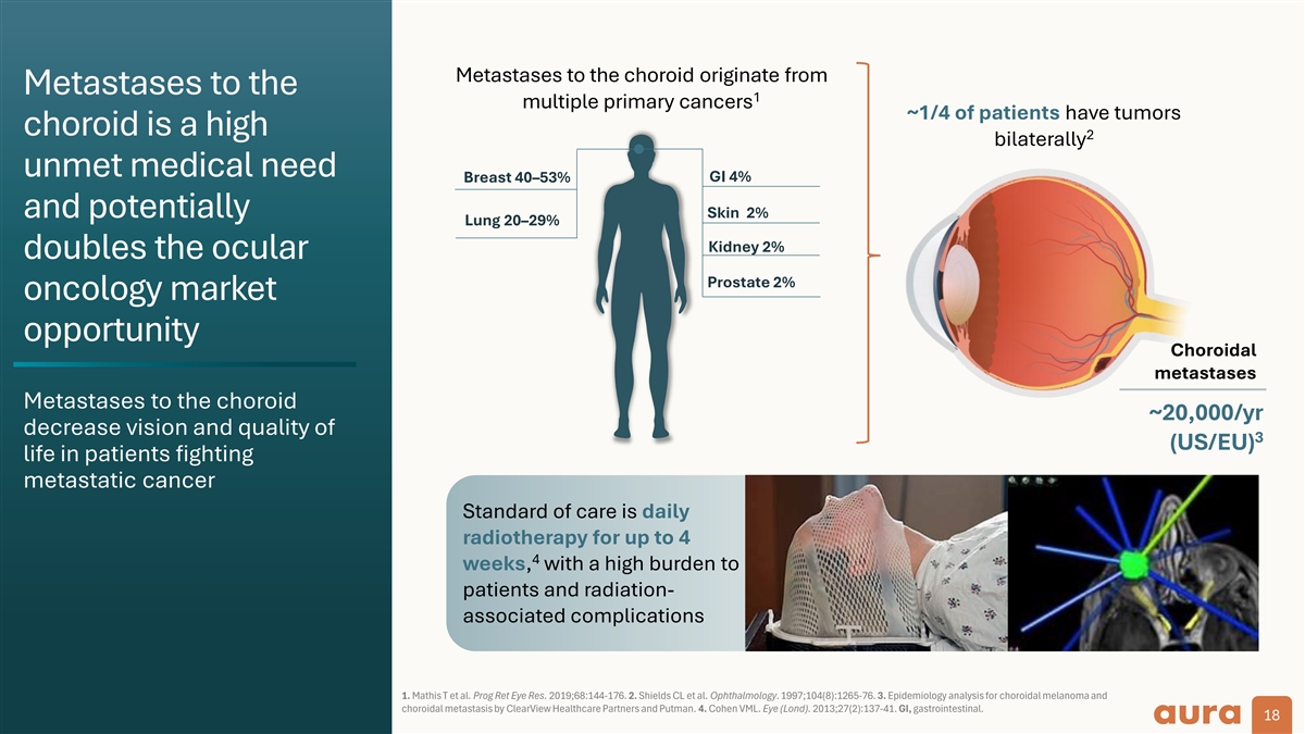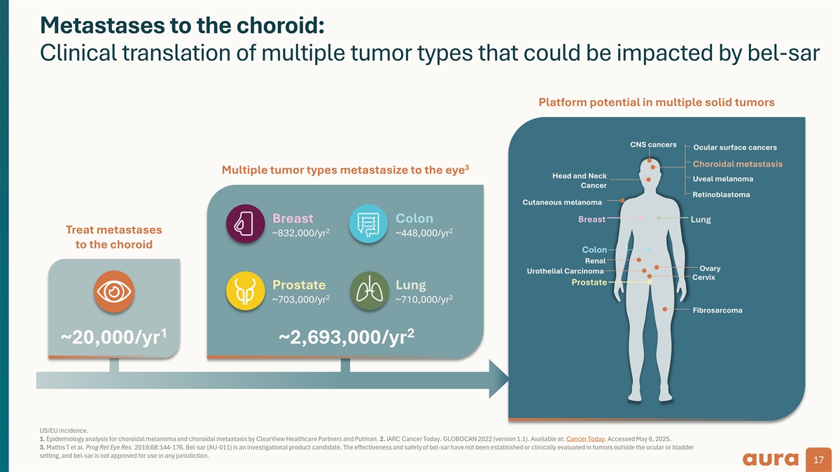 Metastases to the choroid: Clinical translation of multiple tumor types that could be impacted by bel-sar Platform potential in multiple solid tumors CNS cancers Ocular surface cancers Choroidal metastasis 3 Multiple tumor types metastasize to the eye Head and Neck Uveal melanoma Cancer Retinoblastoma Cutaneous melanoma Breast Breast Colon Lung Treat metastases 2 2 ~832,000/yr ~448,000/yr to the choroid Colon Renal Ovary Urothelial Carcinoma Cervix Prostate Prostate Lung 2 2 ~703,000/yr ~710,000/yr Fibrosarcoma 1 2 ~20,000/yr ~2,693,000/yr US/EU incidence. 1. Epidemiology analysis for choroidal melanoma and choroidal metastasis by ClearView Healthcare Partners and Putman. 2. IARC Cancer Today. GLOBOCAN 2022 (version 1.1). Available at: Cancer Today. Accessed May 6, 2025. 3. Mathis T et al. Prog Ret Eye Res. 2019;68:144-176. Bel-sar (AU-011) is an investigational product candidate. The effectiveness and safety of bel-sar have not been established or clinically evaluated in tumors outside the ocular or bladder setting, and bel-sar is not approved for use in any jurisdiction. 17