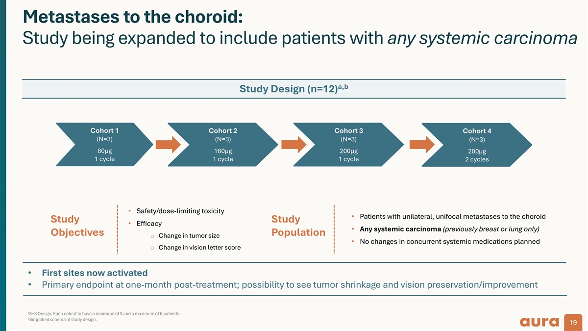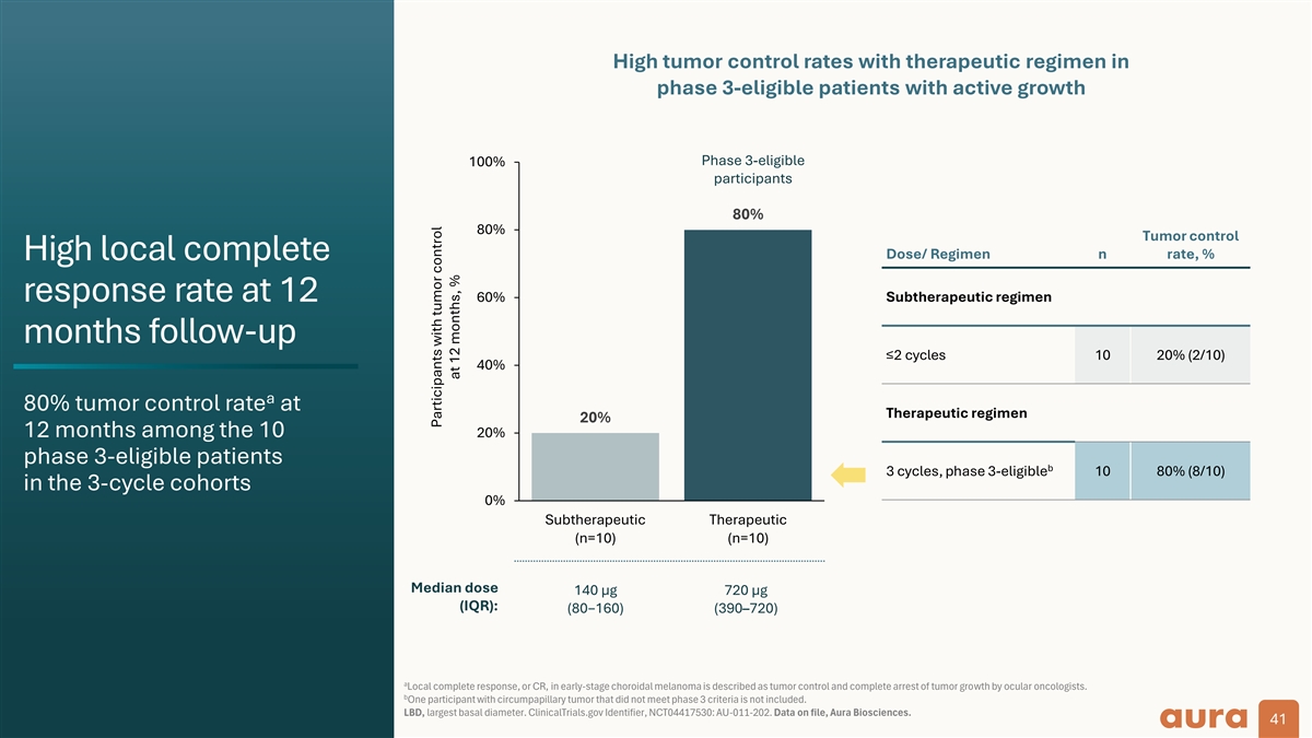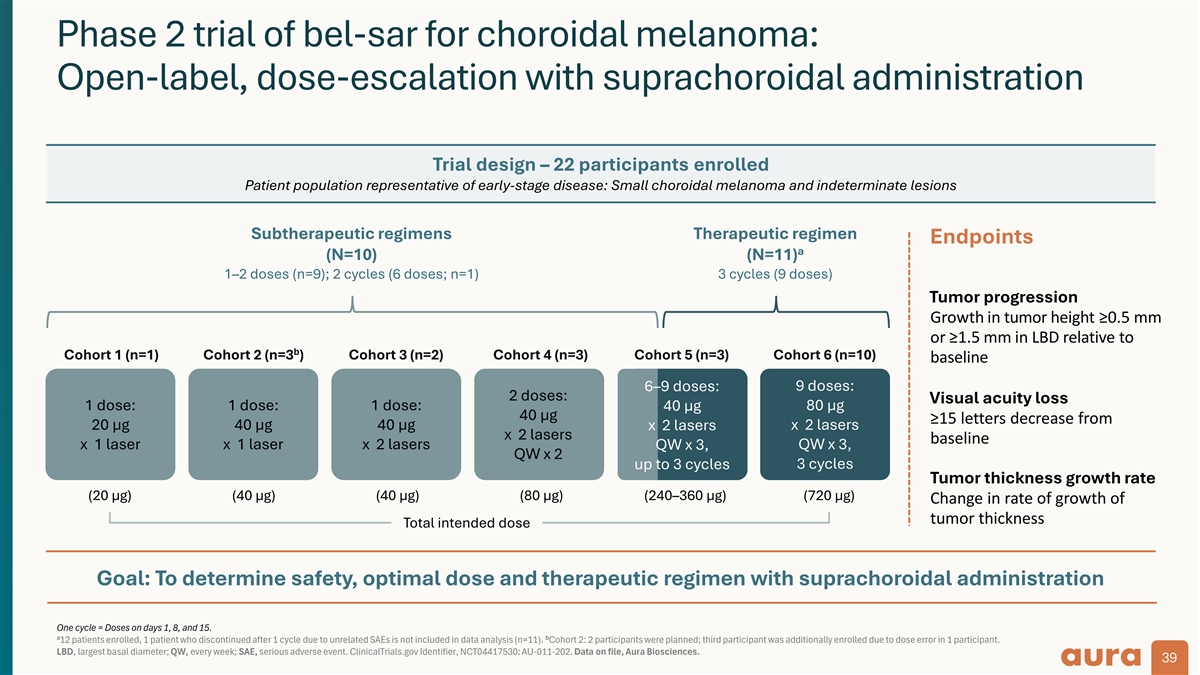 Phase 2 trial of bel-sar for choroidal melanoma: Open-label, dose-escalation with suprachoroidal administration Trial design – 22 participants enrolled Patient population representative of early-stage disease: Small choroidal melanoma and indeterminate lesions Subtherapeutic regimens Therapeutic regimen Endpoints a (N=10) (N=11) 1–2 doses (n=9); 2 cycles (6 doses; n=1) 3 cycles (9 doses) Tumor progression Growth in tumor height ≥0.5 mm or ≥1.5 mm in LBD relative to b Cohort 1 (n=1) Cohort 2 (n=3 ) Cohort 3 (n=2) Cohort 4 (n=3) Cohort 5 (n=3) Cohort 6 (n=10) baseline 6–9 doses: 9 doses: 2 doses: Visual acuity loss 1 dose: 1 dose: 1 dose: 80 μg 40 μg 40 μg ≥15 letters decrease from 20 μg 40 μg 40 μg x 2 lasers x 2 lasers x 2 lasers baseline x 1 laser x 1 laser x 2 lasers QW x 3, QW x 3, QW x 2 3 cycles up to 3 cycles Tumor thickness growth rate (20 µg) (40 µg) (40 µg) (80 µg) (240–360 µg) (720 µg) Change in rate of growth of tumor thickness Total intended dose Goal: To determine safety, optimal dose and therapeutic regimen with suprachoroidal administration One cycle = Doses on days 1, 8, and 15. a b 12 patients enrolled, 1 patient who discontinued after 1 cycle due to unrelated SAEs is not included in data analysis (n=11). Cohort 2: 2 participants were planned; third participant was additionally enrolled due to dose error in 1 participant. LBD, largest basal diameter; QW, every week; SAE, serious adverse event. ClinicalTrials.gov Identifier, NCT04417530: AU-011-202. Data on file, Aura Biosciences. 39