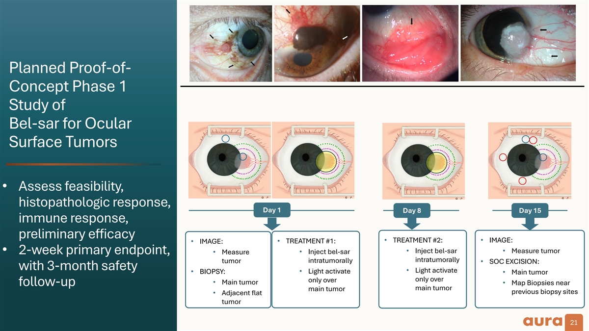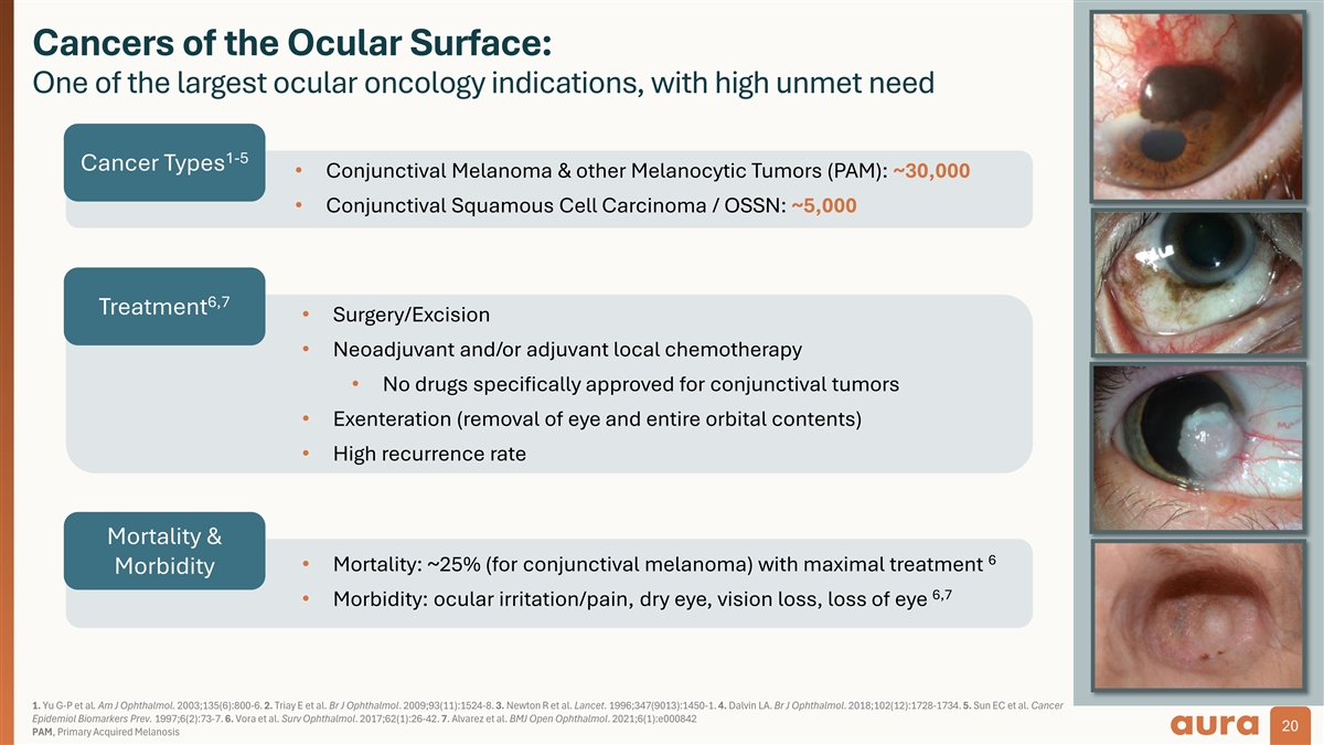 Cancers of the Ocular Surface: One of the largest ocular oncology indications, with high unmet need 1-5 Cancer Types • Conjunctival Melanoma & other Melanocytic Tumors (PAM): ~30,000 • Conjunctival Squamous Cell Carcinoma / OSSN: ~5,000 6,7 Treatment • Surgery/Excision • Neoadjuvant and/or adjuvant local chemotherapy • No drugs specifically approved for conjunctival tumors • Exenteration (removal of eye and entire orbital contents) • High recurrence rate Mortality & 6 • Mortality: ~25% (for conjunctival melanoma) with maximal treatment Morbidity 6,7 • Morbidity: ocular irritation/pain, dry eye, vision loss, loss of eye 1. Yu G-P et al. Am J Ophthalmol. 2003;135(6):800-6. 2. Triay E et al. Br J Ophthalmol. 2009;93(11):1524-8. 3. Newton R et al. Lancet. 1996;347(9013):1450-1. 4. Dalvin LA. Br J Ophthalmol. 2018;102(12):1728-1734. 5. Sun EC et al. Cancer Epidemiol Biomarkers Prev. 1997;6(2):73-7. 6. Vora et al. Surv Ophthalmol. 2017;62(1):26-42. 7. Alvarez et al. BMJ Open Ophthalmol. 2021;6(1):e000842 20 20 PAM, Primary Acquired Melanosis