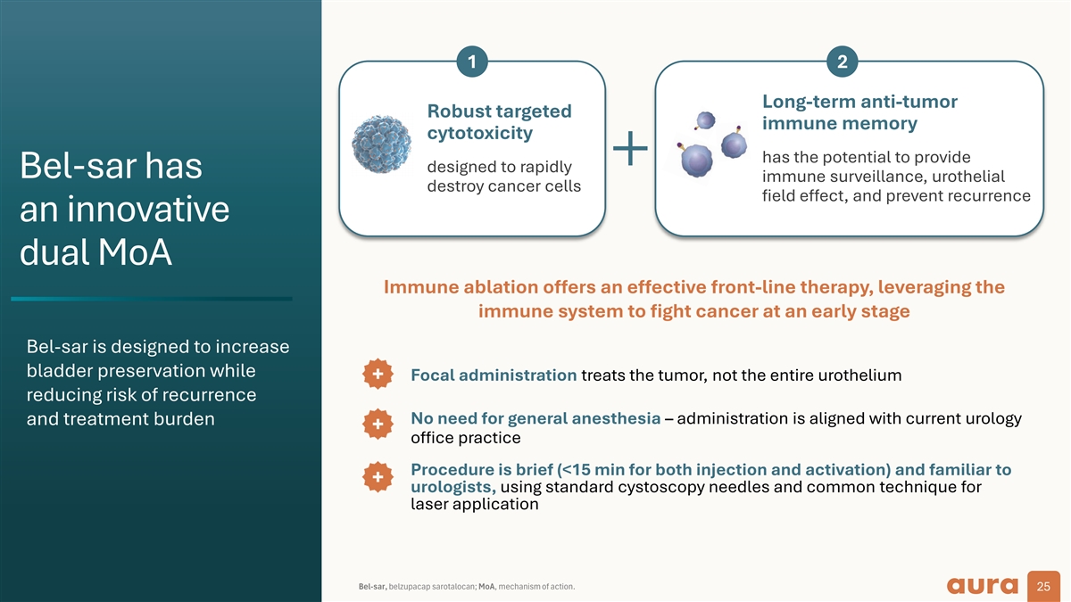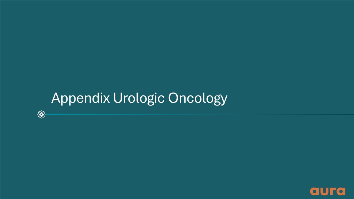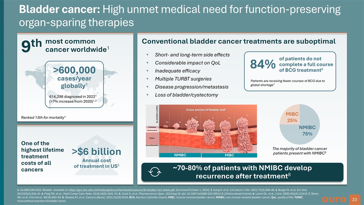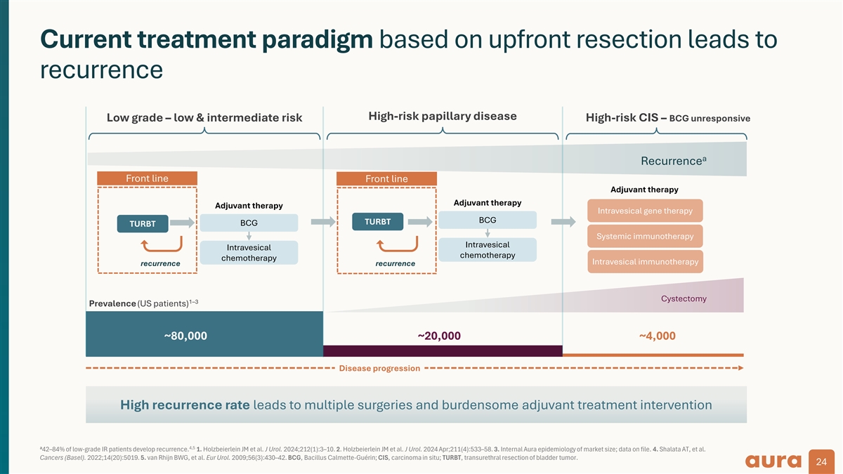 Current treatment paradigm based on upfront resection leads to recurrence High-risk papillary disease Low grade – low & intermediate risk High-risk CIS – BCG unresponsive a Recurrence Front line Front line Adjuvant therapy Adjuvant therapy Adjuvant therapy Intravesical gene therapy BCG TURBT BCG TURBT Systemic immunotherapy Intravesical Intravesical chemotherapy chemotherapy Intravesical immunotherapy recurrence recurrence Cystectomy 1–3 Prevalence (US patients) ~80,000 ~20,000 ~4,000 Disease progression High recurrence rate leads to multiple surgeries and burdensome adjuvant treatment intervention a 4,5 42–84% of low-grade IR patients develop recurrence. 1. Holzbeierlein JM et al. J Urol. 2024;212(1):3–10. 2. Holzbeierlein JM et al. J Urol. 2024 Apr;211(4):533–58. 3. Internal Aura epidemiology of market size; data on file. 4. Shalata AT, et al. Cancers (Basel). 2022;14(20):5019. 5. van Rhijn BWG, et al. Eur Urol. 2009;56(3):430–42. BCG, Bacillus Calmette-Guérin; CIS, carcinoma in situ; TURBT, transurethral resection of bladder tumor. 24