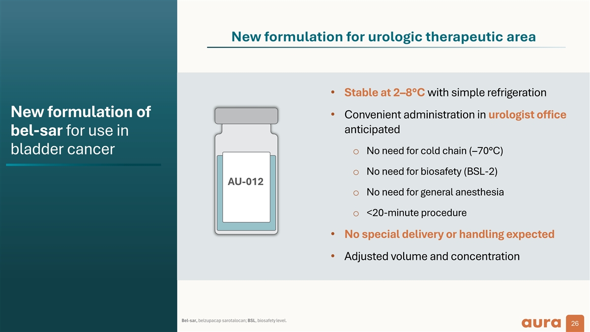 1 2 Long-term anti-tumor Robust targeted immune memory cytotoxicity has the potential to provide designed to rapidly Bel-sar has immune surveillance, urothelial destroy cancer cells field effect, and prevent recurrence an innovative dual MoA Immune ablation offers an effective front-line therapy, leveraging the immune system to fight cancer at an early stage Bel-sar is designed to increase bladder preservation while Focal administration treats the tumor, not the entire urothelium reducing risk of recurrence No need for general anesthesia – administration is aligned with current urology and treatment burden office practice Procedure is brief (<15 min for both injection and activation) and familiar to urologists, using standard cystoscopy needles and common technique for laser application Bel-sar, belzupacap sarotalocan; MoA, mechanism of action. 25