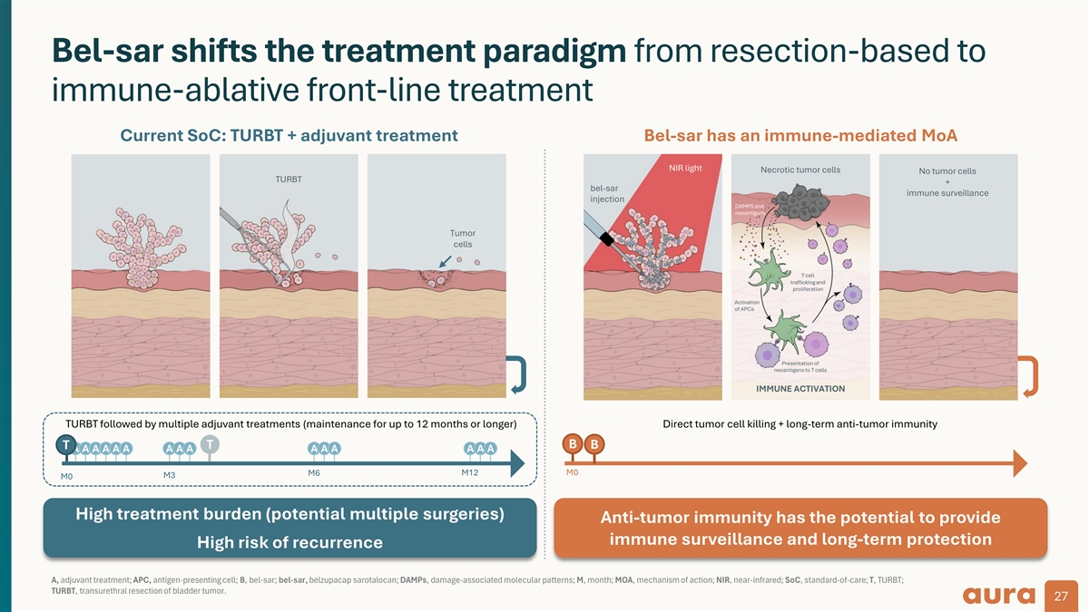 Bel-sar shifts the treatment paradigm from resection-based to immune-ablative front-line treatment Current SoC: TURBT + adjuvant treatment Bel-sar has an immune-mediated MoA NIR light Necrotic tumor cells No tumor cells TURBT + bel-sar immune surveillance injection DAMPS and neoantigens Tumor cells T cell trafficking and proliferation Activation of APCs Presentation of neoantigens to T cells IMMUNE ACTIVATION TURBT followed by multiple adjuvant treatments (maintenance for up to 12 months or longer) Direct tumor cell killing + long-term anti-tumor immunity T B B T A A A A A A A A A A A A A A A M0 M6 M12 M3 M0 High treatment burden (potential multiple surgeries) Anti-tumor immunity has the potential to provide immune surveillance and long-term protection High risk of recurrence A, adjuvant treatment; APC, antigen-presenting cell; B, bel-sar; bel-sar, belzupacap sarotalocan; DAMPs, damage-associated molecular patterns; M, month; MOA, mechanism of action; NIR, near-infrared; SoC, standard-of-care; T, TURBT; TURBT, transurethral resection of bladder tumor. 27