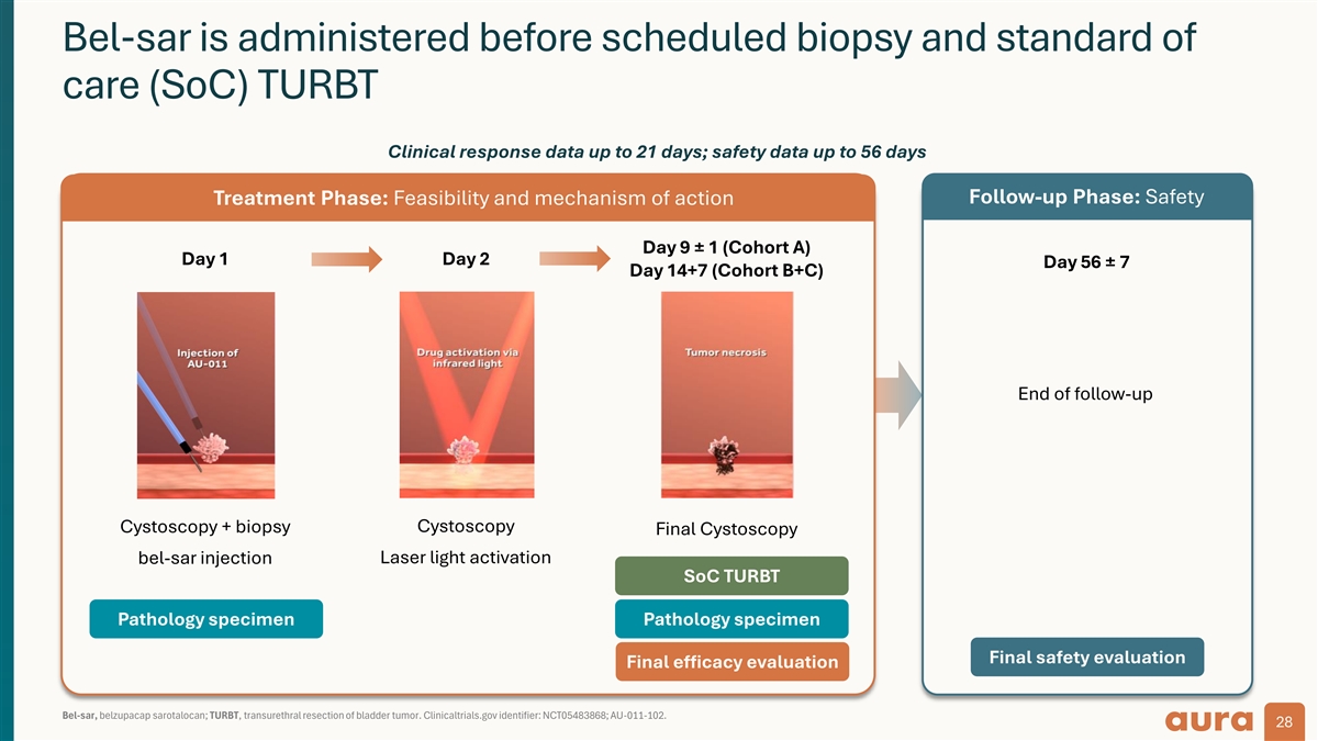 Bel-sar is administered before scheduled biopsy and standard of care (SoC) TURBT Clinical response data up to 21 days; safety data up to 56 days Treatment Phase: Feasibility and mechanism of action Follow-up Phase: Safety Day 9 ± 1 (Cohort A) Day 1 Day 2 Day 56 ± 7 Day 14+7 (Cohort B+C) End of follow-up Cystoscopy + biopsy Cystoscopy Final Cystoscopy bel-sar injection Laser light activation SoC TURBT Pathology specimen Pathology specimen Final safety evaluation Final efficacy evaluation Bel-sar, belzupacap sarotalocan; TURBT, transurethral resection of bladder tumor. Clinicaltrials.gov identifier: NCT05483868; AU-011-102. 28