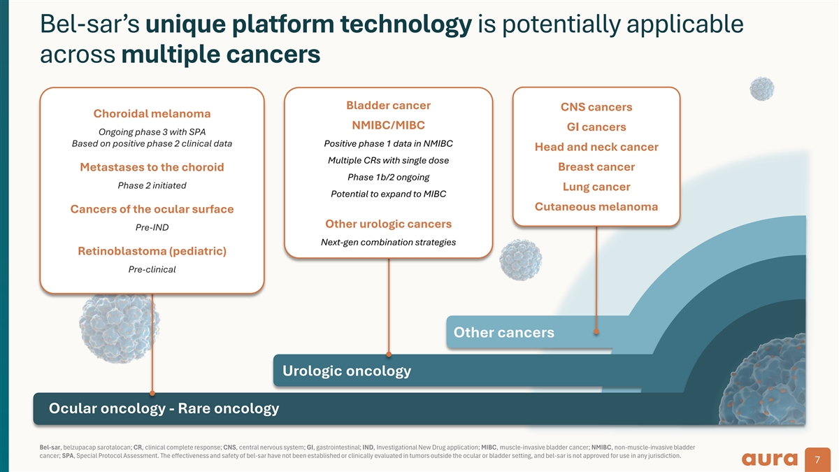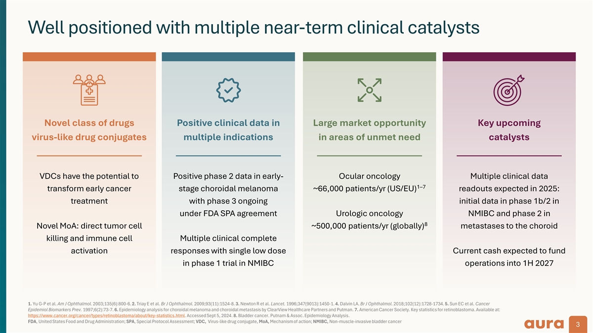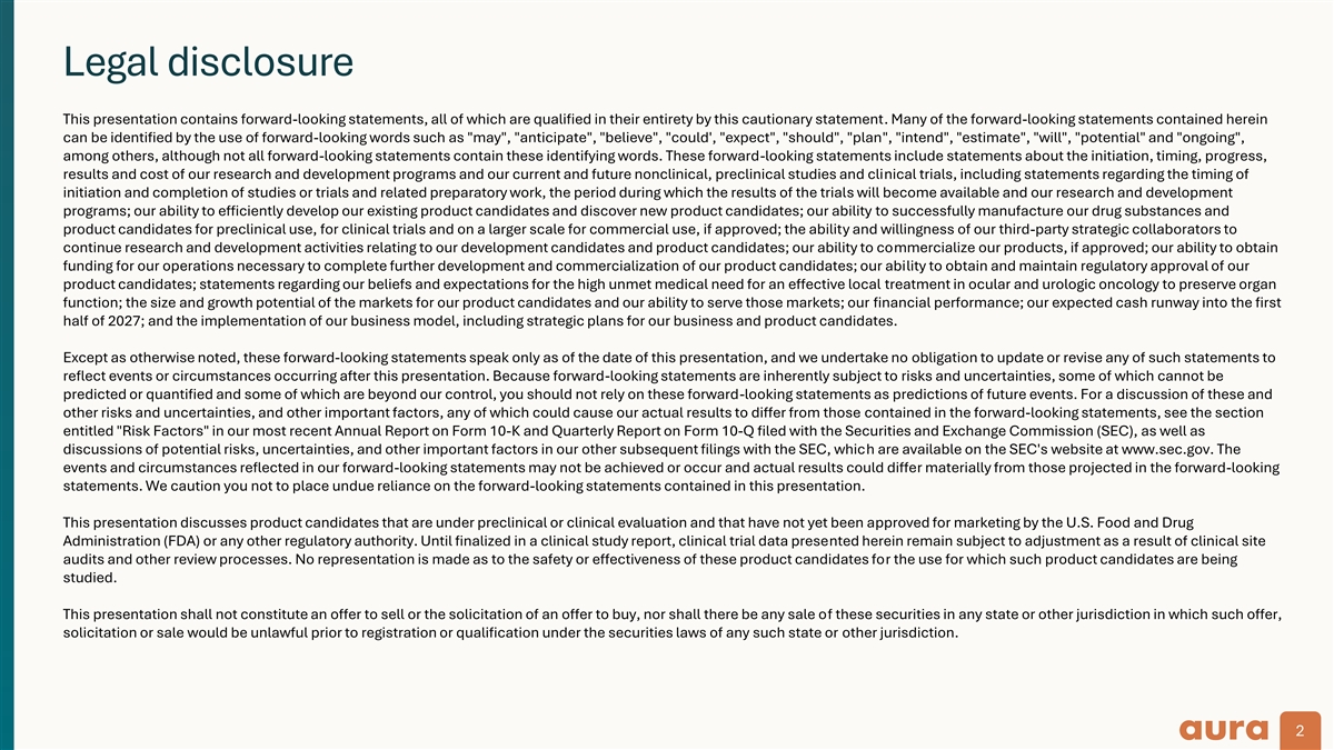 Legal disclosure This presentation contains forward-looking statements, all of which are qualified in their entirety by this cautionary statement. Many of the forward-looking statements contained herein can be identified by the use of forward-looking words such as may , anticipate , believe , could', expect , should , plan , intend , estimate , will , potential and ongoing , among others, although not all forward-looking statements contain these identifying words. These forward-looking statements include statements about the initiation, timing, progress, results and cost of our research and development programs and our current and future nonclinical, preclinical studies and clinical trials, including statements regarding the timing of initiation and completion of studies or trials and related preparatory work, the period during which the results of the trials will become available and our research and development programs; our ability to efficiently develop our existing product candidates and discover new product candidates; our ability to successfully manufacture our drug substances and product candidates for preclinical use, for clinical trials and on a larger scale for commercial use, if approved; the ability and willingness of our third-party strategic collaborators to continue research and development activities relating to our development candidates and product candidates; our ability to commercialize our products, if approved; our ability to obtain funding for our operations necessary to complete further development and commercialization of our product candidates; our ability to obtain and maintain regulatory approval of our product candidates; statements regarding our beliefs and expectations for the high unmet medical need for an effective local treatment in ocular and urologic oncology to preserve organ function; the size and growth potential of the markets for our product candidates and our ability to serve those markets; our financial performance; our expected cash runway into the first half of 2027; and the implementation of our business model, including strategic plans for our business and product candidates. Except as otherwise noted, these forward-looking statements speak only as of the date of this presentation, and we undertake no obligation to update or revise any of such statements to reflect events or circumstances occurring after this presentation. Because forward-looking statements are inherently subject to risks and uncertainties, some of which cannot be predicted or quantified and some of which are beyond our control, you should not rely on these forward-looking statements as predictions of future events. For a discussion of these and other risks and uncertainties, and other important factors, any of which could cause our actual results to differ from those contained in the forward-looking statements, see the section entitled Risk Factors in our most recent Annual Report on Form 10-K and Quarterly Report on Form 10-Q filed with the Securities and Exchange Commission (SEC), as well as discussions of potential risks, uncertainties, and other important factors in our other subsequent filings with the SEC, which are available on the SEC's website at www.sec.gov. The events and circumstances reflected in our forward-looking statements may not be achieved or occur and actual results could differ materially from those projected in the forward-looking statements. We caution you not to place undue reliance on the forward-looking statements contained in this presentation. This presentation discusses product candidates that are under preclinical or clinical evaluation and that have not yet been approved for marketing by the U.S. Food and Drug Administration (FDA) or any other regulatory authority. Until finalized in a clinical study report, clinical trial data presented herein remain subject to adjustment as a result of clinical site audits and other review processes. No representation is made as to the safety or effectiveness of these product candidates for the use for which such product candidates are being studied. This presentation shall not constitute an offer to sell or the solicitation of an offer to buy, nor shall there be any sale of these securities in any state or other jurisdiction in which such offer, solicitation or sale would be unlawful prior to registration or qualification under the securities laws of any such state or other jurisdiction. 2