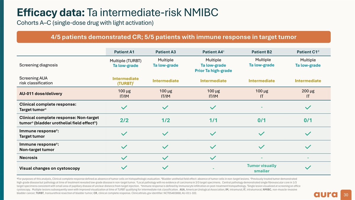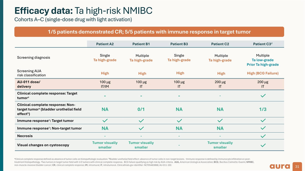 Efficacy data: Ta intermediate-risk NMIBC Cohorts A–C (single-dose drug with light activation) 4/5 patients demonstrated CR; 5/5 patients with immune response in target tumor c d Patient A1 Patient A3 Patient A4 Patient B2 Patient C1 Multiple Multiple Multiple Multiple Multiple (TURBT) Screening diagnosis Ta low-grade Ta low-grade Ta low-grade Ta low-grade Ta low-grade Prior Ta high-grade Screening AUA Intermediate Intermediate Intermediate Intermediate Intermediate f risk classification (TURBT) 100 µg 100 µg 100 µg 100 µg 200 µg AU-011 dose/delivery IT/IM IT/IM IT/IM IT IT Clinical complete response: - a Target tumor Clinical complete response: Non-target 2/2 1/2 1/1 0/1 0/1 a b tumor (bladder urothelial field effect ) e Immune response : Target tumor e Immune response : Non-target tumor Necrosis - - Tumor visually Visual changes on cystoscopy - smaller a b c For purposes of this analysis, Clinical complete response defined as absence of tumor cells on histopathologic evaluation. Bladder urothelial field effect: absence of tumor cells in non-target lesions. Previously treated tumor demonstrated d high-grade disease but pathology at time of treatment revealed low-grade disease in non-target tumor. Local pathology with no evidence of carcinoma in 3/3 target specimens. Central pathology demonstrated single fibrovascular core in 1/3 e f target specimens consistent with small area of papillary disease of unclear distance from target injection. Immune response is defined by immunocyte infiltration on post-treatment histopathology. Single lesion visualized at screening on office cystoscopy. Multiple lesions subsequently seen with improved visualization at time of TURBT qualifying for intermediate risk classification. AUA, American Urological Association; IM, intramural; IT, intratumoral; NMIBC, non-muscle-invasive bladder cancer; TURBT, transurethral resection of bladder tumor; CR, clinical complete response. Clinicaltrials.gov identifier: NCT05483868; AU-011-102. 30