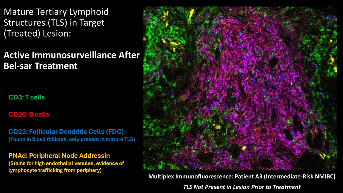 Mature Tertiary Lymphoid Structures (TLS) in Target (Treated) Lesion: Active Immunosurveillance After Bel-sar Treatment CD3: T cells CD20: B cells CD23: Follicular Dendritic Cells (FDC) (Found in B cell follicles, only present in mature TLS) PNAd: Peripheral Node Addressin (Stains for high endothelial venules, evidence of lymphocyte trafficking from periphery) Multiplex Immunofluorescence: Patient A3 (Intermediate-Risk NMIBC) TLS Not Present in Lesion Prior to Treatment