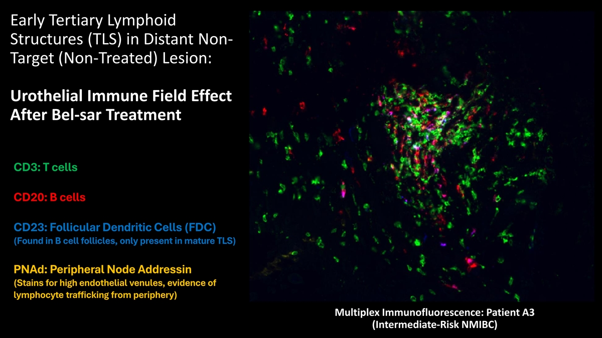 Early Tertiary Lymphoid Structures (TLS) in Distant Non- Target (Non-Treated) Lesion: Urothelial Immune Field Effect After Bel-sar Treatment CD3: T cells CD20: B cells CD23: Follicular Dendritic Cells (FDC) (Found in B cell follicles, only present in mature TLS) PNAd: Peripheral Node Addressin (Stains for high endothelial venules, evidence of lymphocyte trafficking from periphery) Multiplex Immunofluorescence: Patient A3 (Intermediate-Risk NMIBC)
