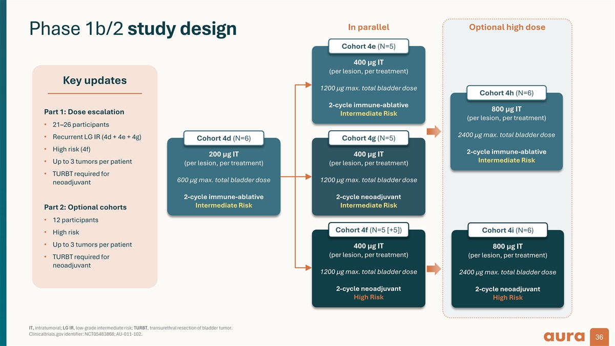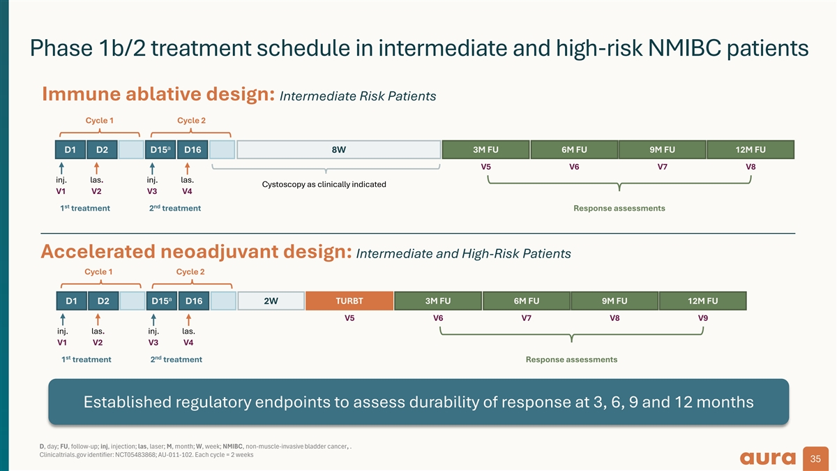 Phase 1b/2 treatment schedule in intermediate and high-risk NMIBC patients Immune ablative design: Intermediate Risk Patients Cycle 1 Cycle 2 a D1 D2 D15 D16 8W 3M FU 6M FU 9M FU 12M FU V5 V6 V7 V8 inj. las. inj. las. Cystoscopy as clinically indicated V1 V2 V3 V4 st nd 1 treatment 2 treatment Response assessments Accelerated neoadjuvant design: Intermediate and High-Risk Patients Cycle 1 Cycle 2 a D1 D2 D15 D16 2W TURBT 3M FU 6M FU 9M FU 12M FU V5 V6 V7 V8 V9 inj. las. inj. las. V1 V2 V3 V4 st nd 1 treatment 2 treatment Response assessments Established regulatory endpoints to assess durability of response at 3, 6, 9 and 12 months D, day; FU, follow-up; inj, injection; las, laser; M, month; W, week; NMIBC, non-muscle-invasive bladder cancer, . Clinicaltrials.gov identifier: NCT05483868; AU-011-102. Each cycle = 2 weeks 35