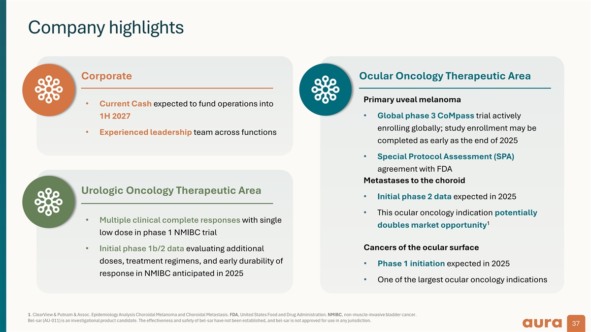 Company highlights Corporate Ocular Oncology Therapeutic Area Primary uveal melanoma • Current Cash expected to fund operations into 1H 2027• Global phase 3 CoMpass trial actively enrolling globally; study enrollment may be • Experienced leadership team across functions completed as early as the end of 2025 • Special Protocol Assessment (SPA) agreement with FDA Metastases to the choroid Urologic Oncology Therapeutic Area • Initial phase 2 data expected in 2025 • This ocular oncology indication potentially • Multiple clinical complete responses with single 1 doubles market opportunity low dose in phase 1 NMIBC trial Cancers of the ocular surface • Initial phase 1b/2 data evaluating additional doses, treatment regimens, and early durability of • Phase 1 initiation expected in 2025 response in NMIBC anticipated in 2025 • One of the largest ocular oncology indications 1. ClearView & Putnam & Assoc. Epidemiology Analysis Choroidal Melanoma and Choroidal Metastasis. FDA, United States Food and Drug Administration. NMIBC, non-muscle-invasive bladder cancer. Bel-sar (AU-011) is an investigational product candidate. The effectiveness and safety of bel-sar have not been established, and bel-sar is not approved for use in any jurisdiction. 37